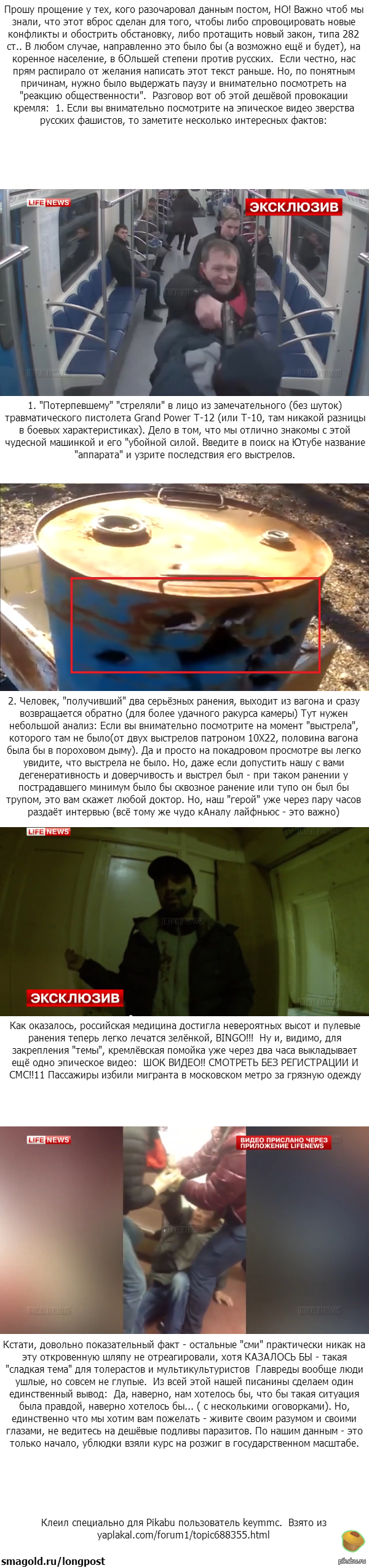 что за бред? ты это все серьезно написал? вот скажи мне - как кто-то там определил что за ствол у человека? во-первых ничего не видно толком, а во-вторых травматы делаются чаще всего точными копиями огнестрельных инструментов. например, у меня - травматический пистолет внешне АБСОЛЮТНО неотличимый от Пистолета Макарова. и если бы я попал на какое-то аналогисное видео - про меня бы что, говорили что я стрелял из Макарова и анализировали последствия? никакого порохового дыма или чего бы то ни было при стрельбе из травматики нет. только шум. не ведитесь на этот дырявый идиотский пост. просто бредятина откровенная. по поводу травм. в полете пуля превращается в резиновый шарик. нанести серьезные повреждения этому шарику очень трудно. не просто так же это оружие травматическое. оно даже менее опасно чем нож. одному моему знакомому, живущему в бишкеке (русскому), грабитель выпустил из травмата целую обойму в голову. и он не погиб и даже не инвалид. не вру. хотя врачи и менты говорят что он счастливчик и это удивительный случай, - но тем не менее факт. его счастье что пули не попали в глаза или рот. целая обойма в голову и только два шрама видимых (на лбу и на щеке), еще три в волосах невидимых, а остальные пули даже шрамов не оставили.