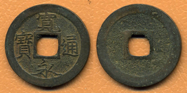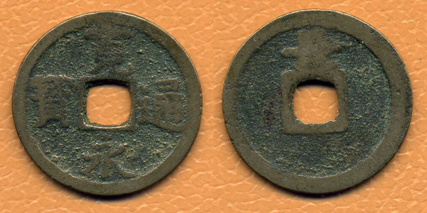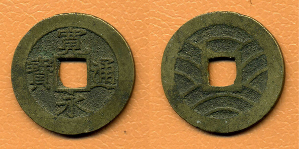 寛永通寳 - Kan'ei tsūhō - Канъэй цухо. Нами-сэн (Nami-sen 波錢). Тип Мэйва-сэн (Meiwa-sen 明和錢) или Ао-сэн (Ao-sen 青錢).