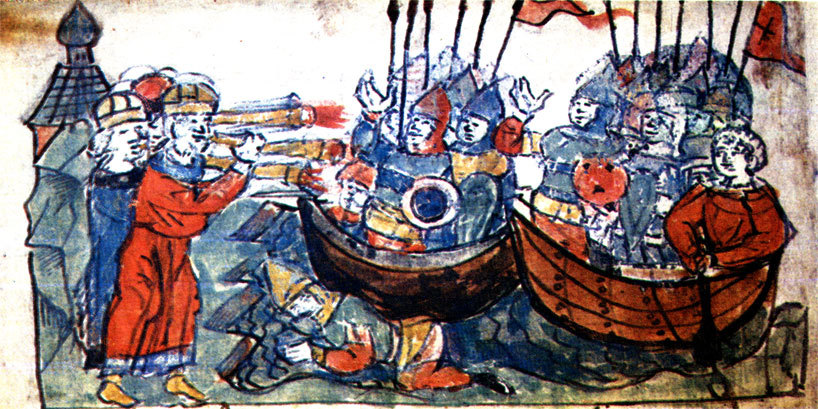 Итак, заняв позицию в середине русского [войска], они [начали] бросать огонь во все стороны. Руссы, увидев это, сразу стали бросаться с судов в море, предпочитая лучше утонуть в волнах, нежели сгореть в огне. Одни, отягощённые кольчугами и шлемами, сразу пошли на дно морское, и их более не видели, а другие, поплыв, даже в воде продолжали гореть; никто не спасся в тот день, если не сумел бежать к берегу. Ведь корабли руссов из-за своего малого размера плавают и на мелководье, чего не могут греческие хеландии из-за своей глубокой осадки."