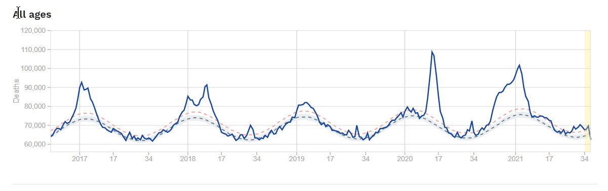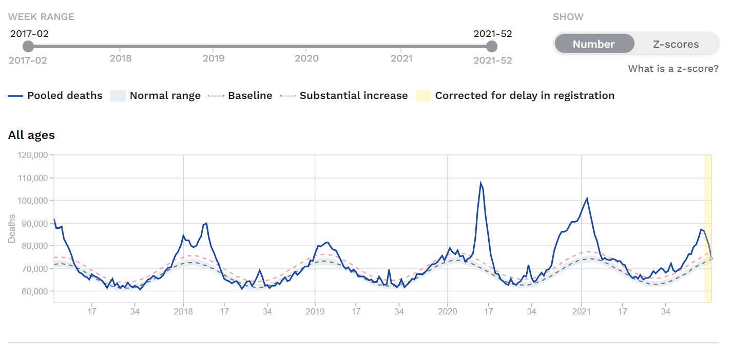 Вот график смертности по годам в Европе. Пики синего цвета - это повышенная по сравнению с медианой смертность. Соответственно площадь пика - это сколько людей унесла страшная болезнь. А теперь прикиньте насколько ужасный коронавирус страшнее обычного гриппа - пики 17 и 18 годов. В 19м почему-то грипп был куда слабее. Чиста на глазок - раза в полтора, от силы в два. Ок, может и в три. Но надо еще отнять сколько-то умерших от того что им из-за короны отменили плановые операции и т.п. И еще уменьшить чуток из-за роста населения Европы в целом. Так что наверное все таки ковид аж в два с половиной раза опаснее гриппа. Ну как, стоило из-за этого всю планету на стоп-кран поставить? И этот цирк уже третий год продолжается. https://www.euromomo.eu/graphs-and-maps/