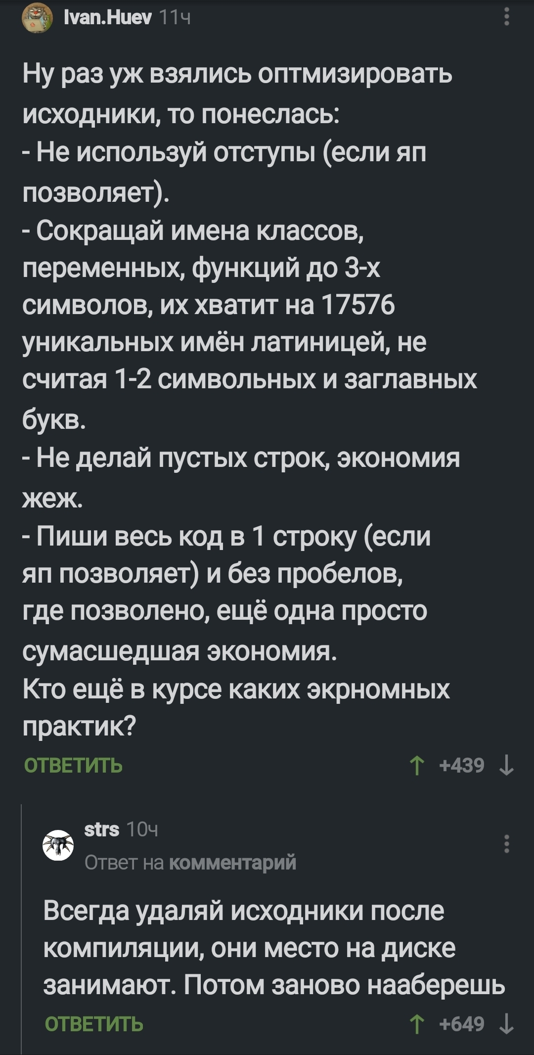 10 Orleshka Баяны Немного про оптимизацию кода 4 года назад #comment_201248687 Оптимизация Код Длиннопост Скриншот Комментарии на Пикабу Ещё 0
