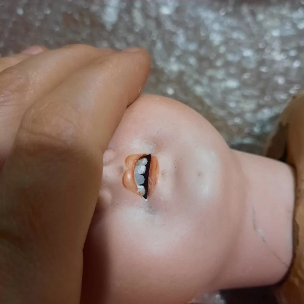 Конечно можно приобрести полностью фарфоровую вставную гребеночку зубов, можно даже антикварных. Но цены на них так кусаются, кроме того вряд ли удалось бы удалить существующие без ущерба для головки, которая и так склеена и может разрушиться от неверных движений. Поясню, что к пустой внутри кукольной головке с открытым ртом приклеивалась изнутри полоска фарфоровых зубов, отлитых в комплектации 2,4 или 6 штук, потом вставлялись глаза, которые либо приклеивались гипсом намертво, либо имели "спящий" механизм.