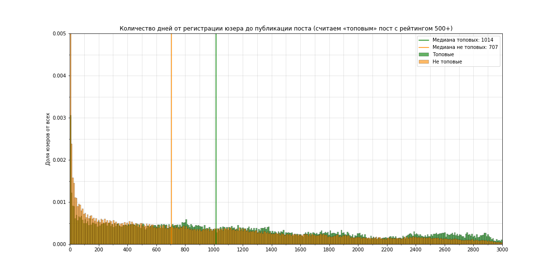 Мы выбрали посты за последний год и разделили их на "топовые" и "не топовые" до 500 рейтинга и свыше 500. И вот какие данные мы получили: