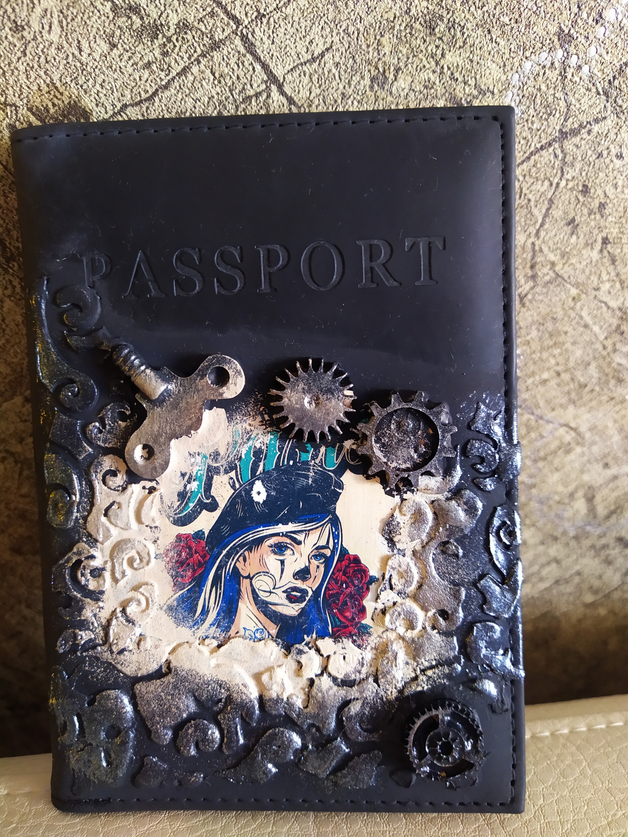 Всем привет. Решила тут немного похендмейдить на тему стимпанка. Для этого очень пригодилась дешевая обложка на паспорт от незабвенного, великого и могучего ибн Алиэкспресса. Хотела в центре поместить свой незабвенный фейс-идентификатор, но почему-то рисовать на нем черепные кости показалось дурным знаком в свете неспокойной обстановки в России и за рубежом. В общем, слепила из того, что было - кожа молодого дермантина, всякие шестеренки из эпоксидки, трафарет и паста из ПВА и ветонита ЛН, акриловые мазюкалки.