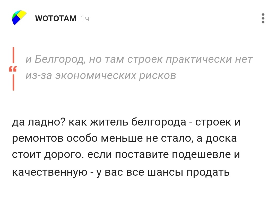 Теперь заказов практически нет, у многих остался лес по 8500₽ и долги. У оптовиков склады забиты доской по 17000₽, мы поставляли на Калининград, Краснодар и Белгород, но там строек практически нет из-за экономических рисков, (в случае Белгорода из-за ряда других взрывоопасных моментов). Сейчас основной вопрос, как не потерять людей, но вариантов практически нет, кроме полной остановки, после переработки остатков леса (у нас остатков практически нет). Но опять же, у нас небольшое производство, так что мы не потеряли 20 миллионов рублей как некоторые, мы также работали в других направлениях, изготовление доски для поддонов, плюс переработка отходов на брикеты, но всё это остановилось, так как коллектив на паллетке поставил ультиматум, что или оставляем цену за изготовленный куб 2200₽ (мы предлагали 1700₽) при цене за куб 1 сорта 8000₽ и 2 сорта 5000₽ или они уходят и ездят как и раньше на вахту в Москву, нам проще было остановиться, чем работать в убыток.