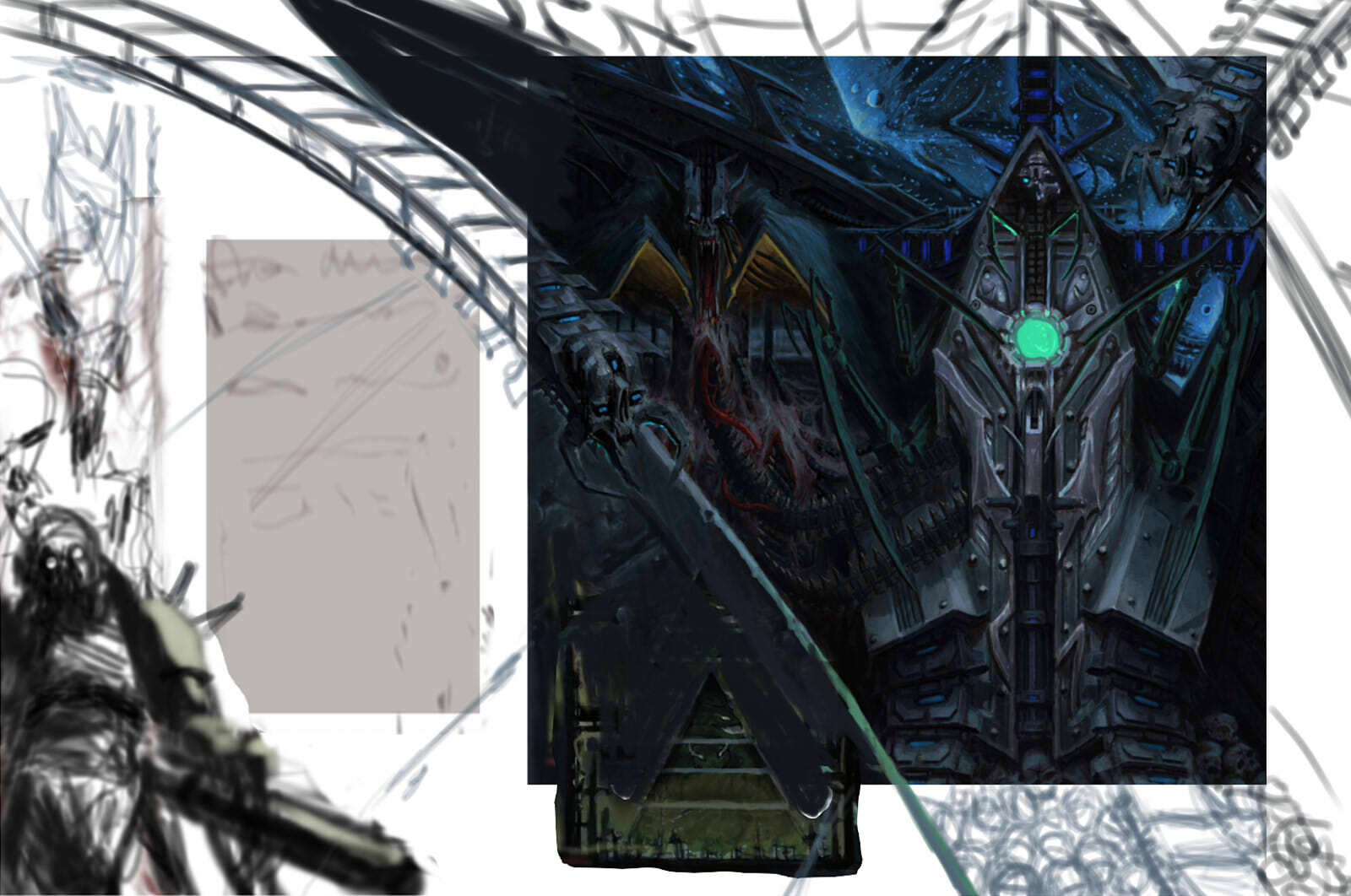 По задумке надо было изобразить одержимого , выращенного для войны и поражённого "идеологической проказой" - по дизайну, персонаж(слева внизу), получился похож на десантника из вархаммера 40K )