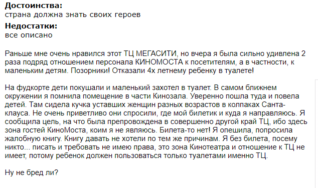 Совсем рядом с фудкортом есть туалет тц, но надо было попереть в туалет кинотеатра и начать там скандалить.