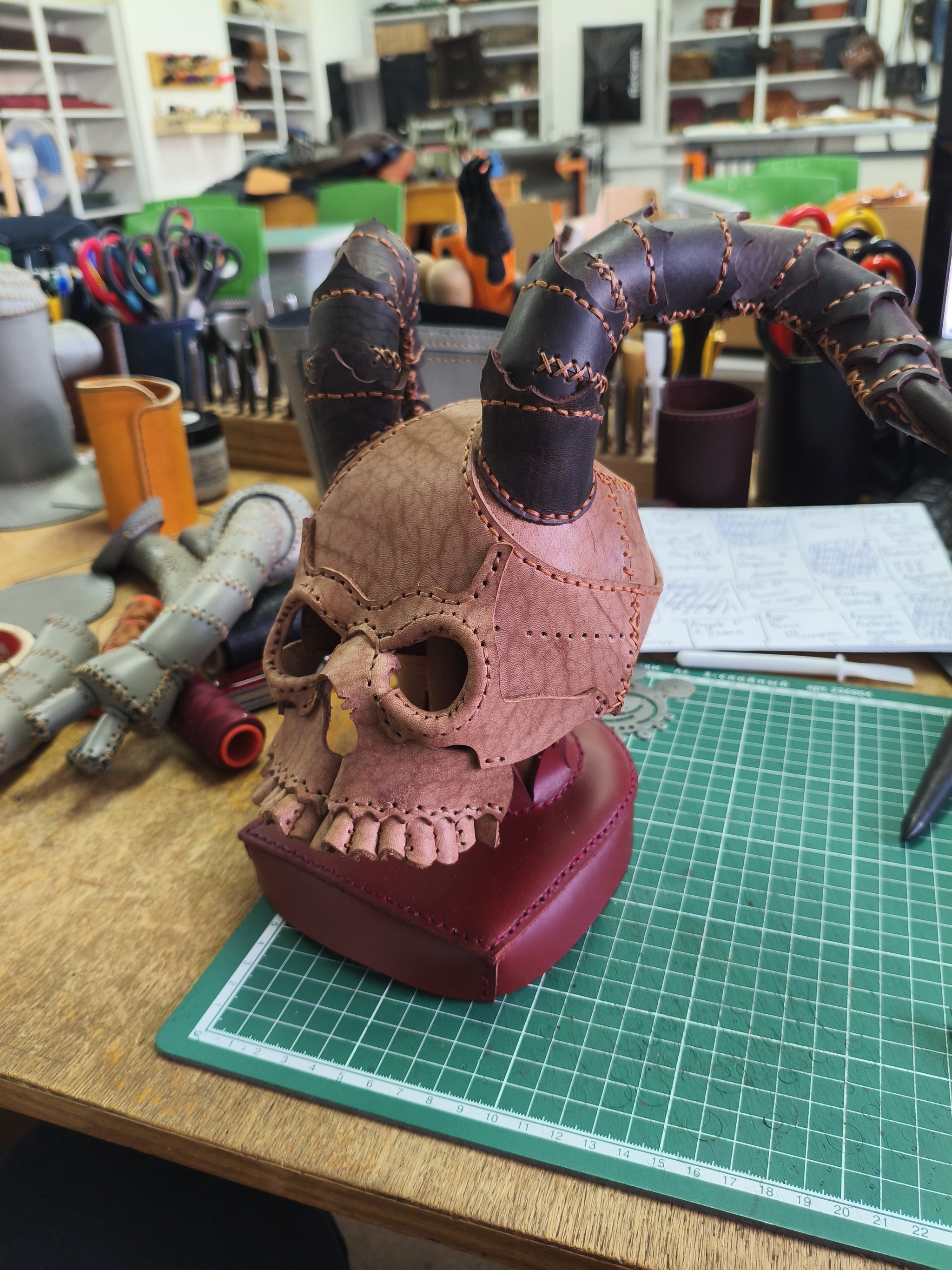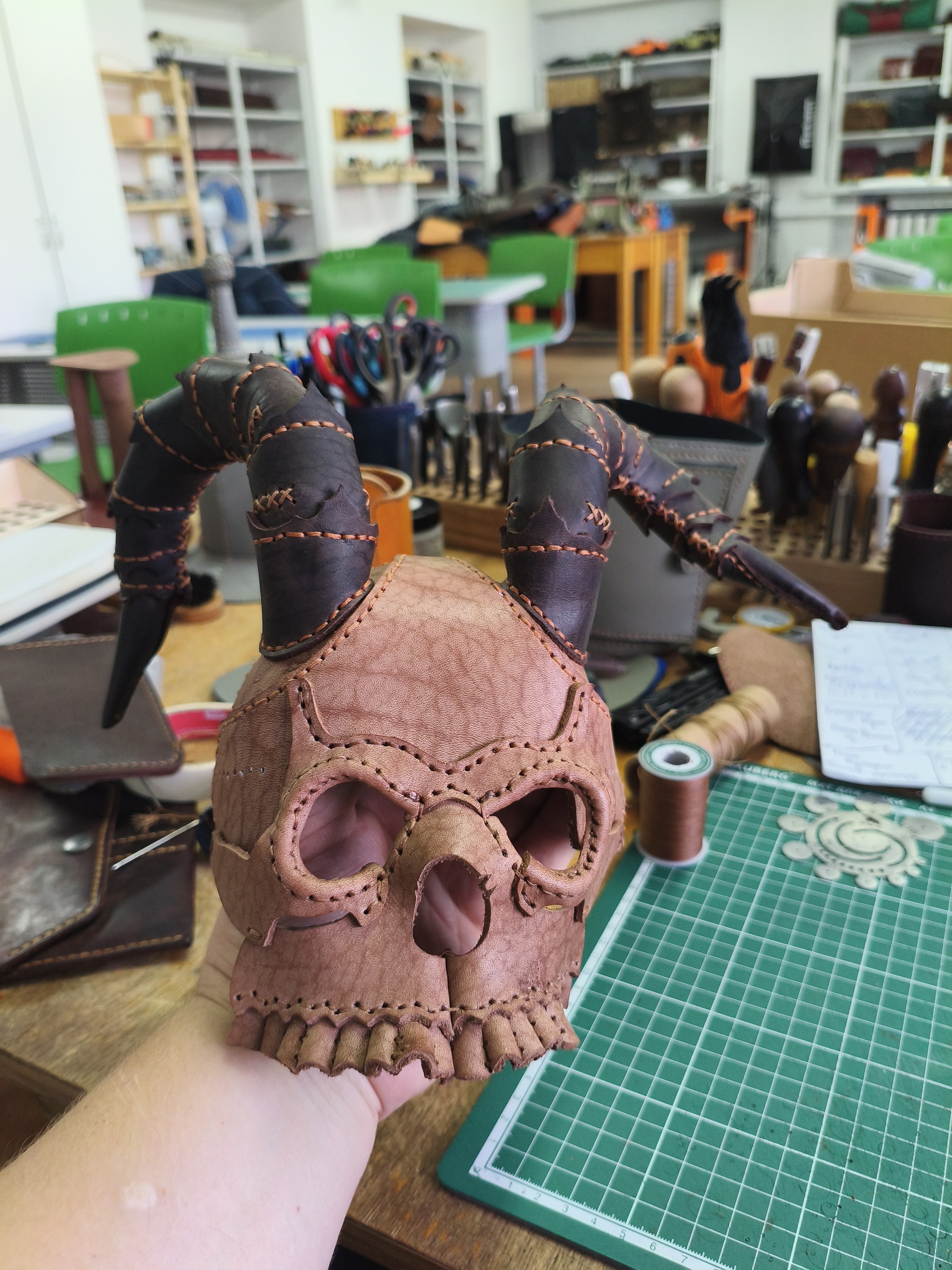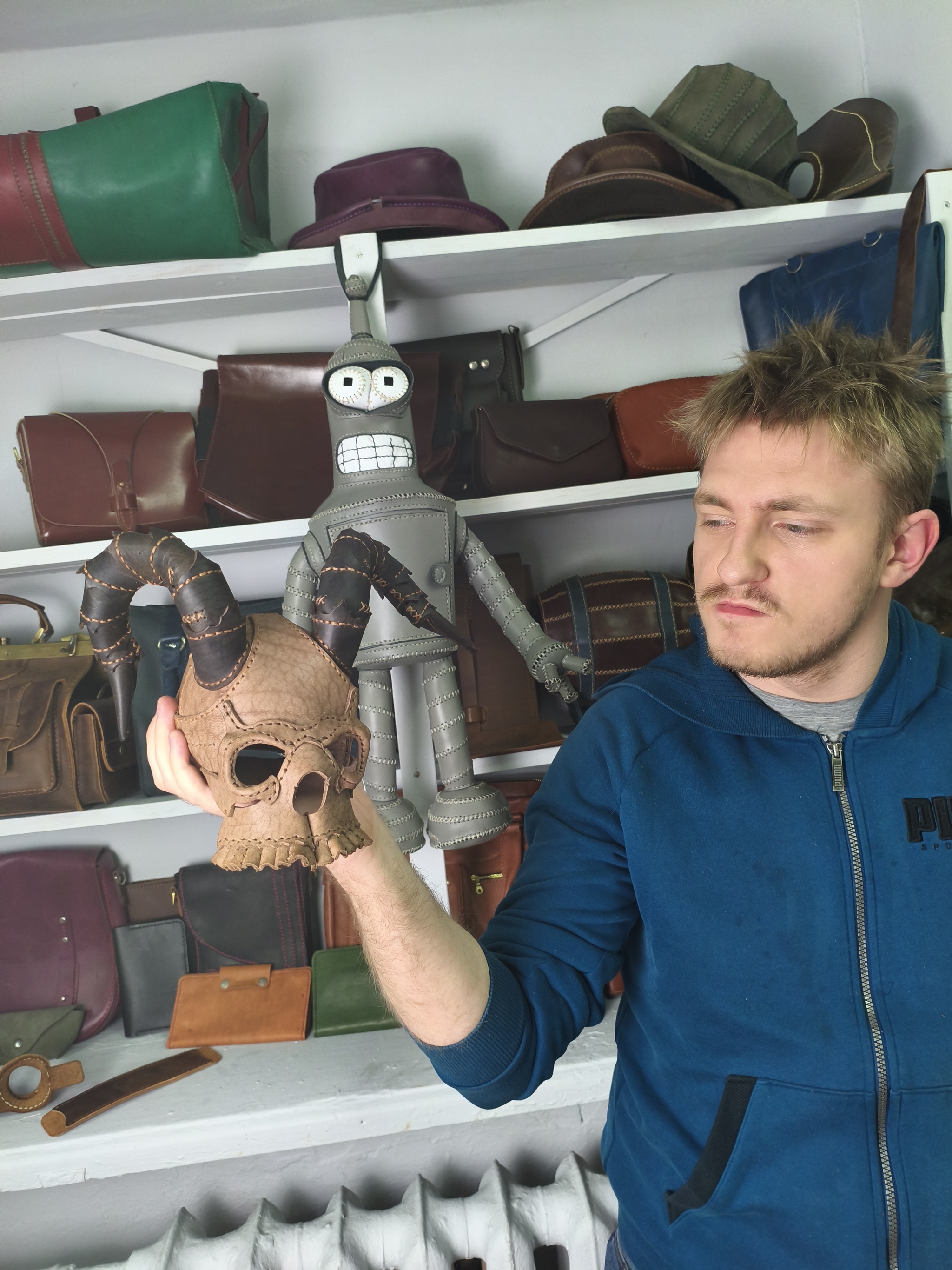 Нет, это Кирилл с Романом. Скорее интерес был в сложности изделия, используется только кожа и нить. Много необычных техник пошива. Зубы не совсем хорошо вышли, возможно, переделаем. Но штука антуражная. Ещё пару аксессуаров думаю будет к хеллоуину. Мне в принципе сам праздник не особо интересен. Но вот выкроек прикольных много.