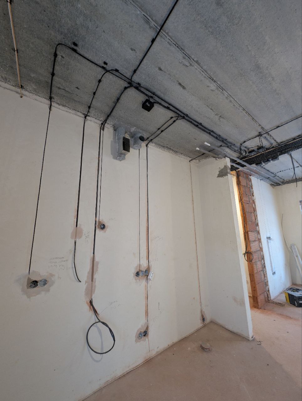 У Валерия Олеговича идиосинкразия на гипс и алебастр, поэтому замазать штробы и подрозетники снова должен был сделать я. Причём не просто прихватить кабель местами, а замазать штробы от и до.