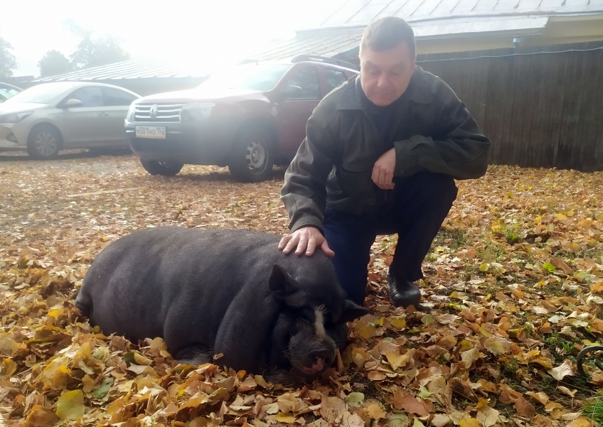 Пинки - свинья породы вьетнамская вислобрюхая. Живет в небольшом гостевом доме в Суздале.