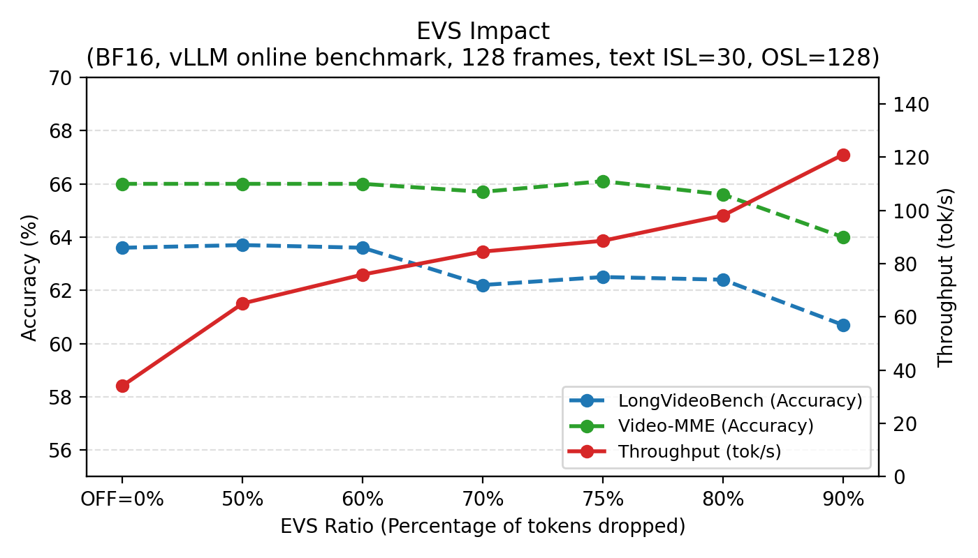 Абляционный анализ EVS, проведенный на RTX 6000 PRO SE с использованием онлайн-бенчмарка vLLM (128 кадров, текстовые параметры ISL=30, OSL=128), демонстрирует, что как результаты в формате BF16, так и FP8, представленные в виде численных таблиц (точность, время TTFT, пропускная способность) и соответствующих визуализаций, позволяют оценить влияние различных конфигураций.