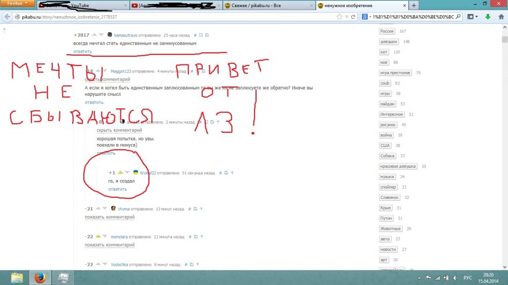Я ставлю минусы только /баянам/"очень смешным шуткам"/неадеватам , потому что в основном сижу в свежем,а + не поставил потому что не видео еще годного поста, были хорошие , но я думаю + нужно заслужить