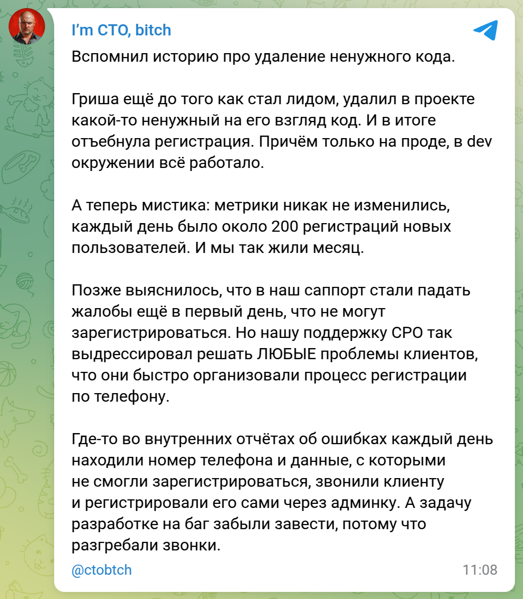 3916 imctobitch Норм автор IT-юмор Серия I'm CTO, bitch Ненужный код2 9 месяцев назад 😡 Телеграм-канал [моё] I`m CTO bitch Юмор Истории из жизни Колл-центр Служба поддержки IT юмор Скриншот Григорий Решение проблемы Код Идиотизм Мат 105 20 13 11 8 Ещё 0
