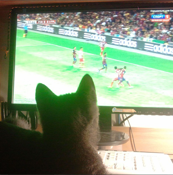 Но котейка молодцом, футбол со мной смотрит, серьезно, лежит и смотрит футбол) Движение мяча сопровождается движение головы :D Мечта, я не кот, с кличкой не прогадал)