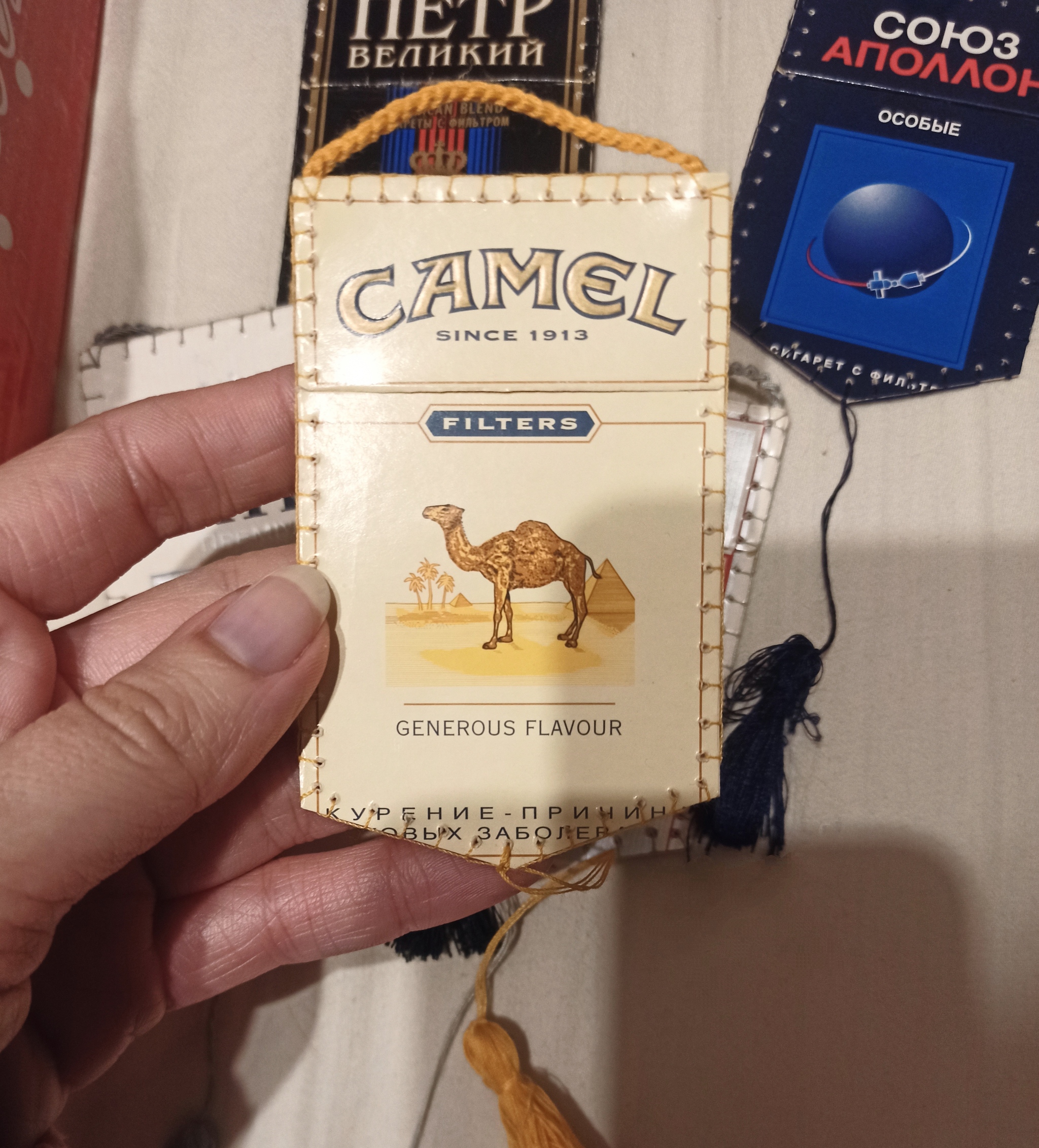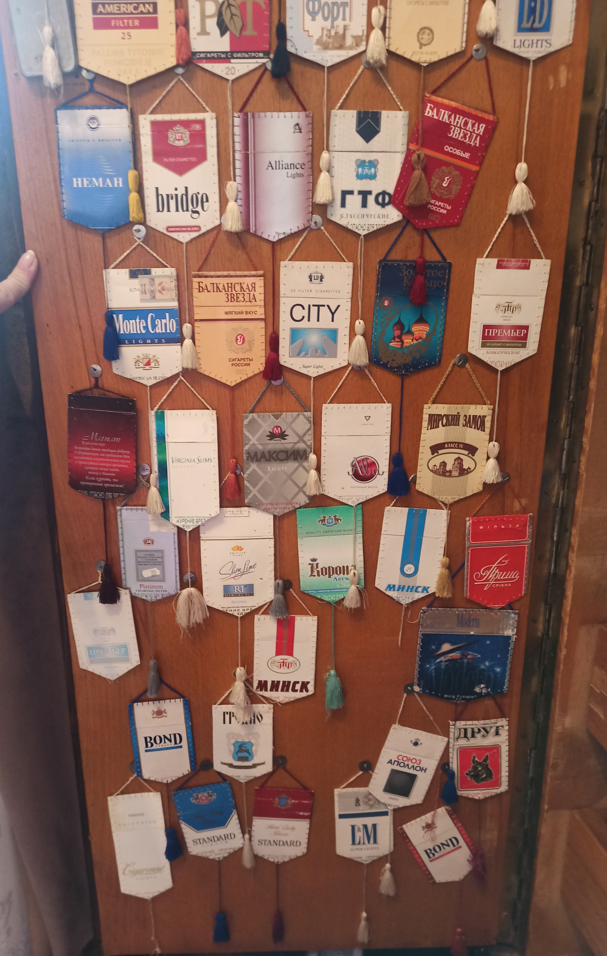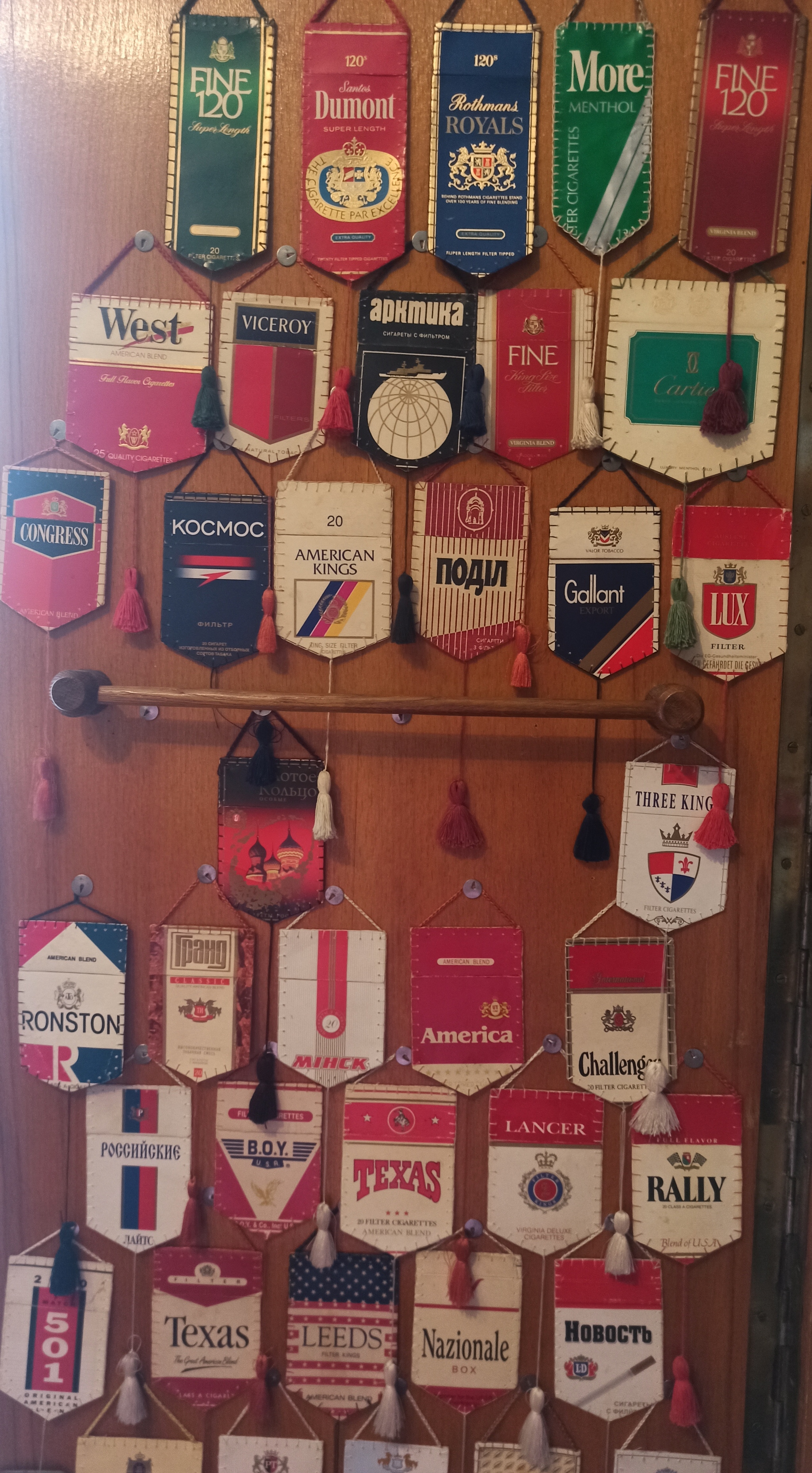 Думаю, каждый из нас в своей жизни занимался коллекционированием чего-либо.Это могли быть красивые камешки, игрушки из яиц "Киндер", деньги, как бумажные, так и монетки, почтовые марки, даже коробки из-под чая (это была моя детская коллекция). Здесь я хочу показать коллекцию моей мамы. Это вымпелы из коробок от сигарет. Идею она подсмотрела в автобусе, в котором ехала в наш город лет 20 назад) Занималась она этим до того, пока на коробках не появились устрашающие надписи и фотографии. У меня, кстати, данные вымпелы в детстве вызывали большой интерес, любила заглянуть в шкаф чтобы поглазеть на все это.