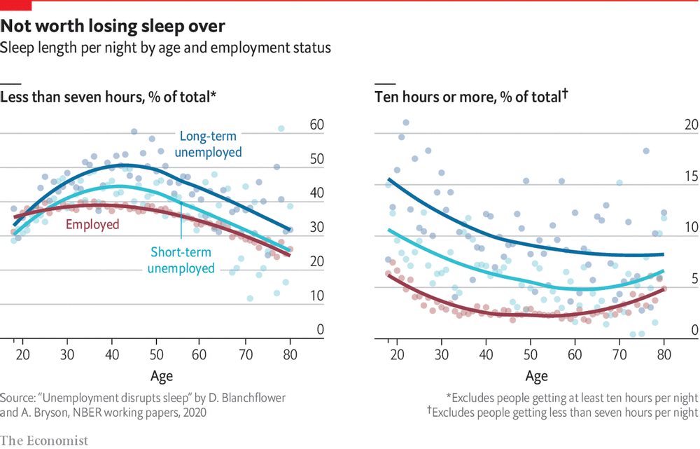 Есть такие, на которые и ответа-то однозначного нет. Хороши ли половые квоты для бизнеса? Хоть тема модная, и Economist, идя в русле политики, "топит" за неё, и они вынуждены признать, что на данный момент - непонятно, на пользу это или нет. Или как животные используют магнитное поле для ориентации (на данный момент - лишь догадки). Или почему американцы всё больше спят: старение населения? Быть может, если принять во внимание U-образную кривую зависимости продолжительности сна от возраста. А может быть это рост безработицы, о чём заставляет задуматься график из того же Economist, вышедшего уже в прошлом сентябре?