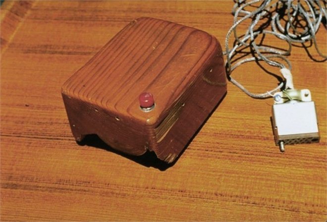 Изобретатель мышки Дуглас Карл Энгельбарт и самая первая мышь, образца 1964 года.