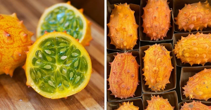 Кивано. Где растёт: Африка, Австралия, Новая Зеландия, Израиль, Коста-Рика, Чили. Вкус: Напоминает что-то среднее между бананом, киви, огурцом и авокадо.