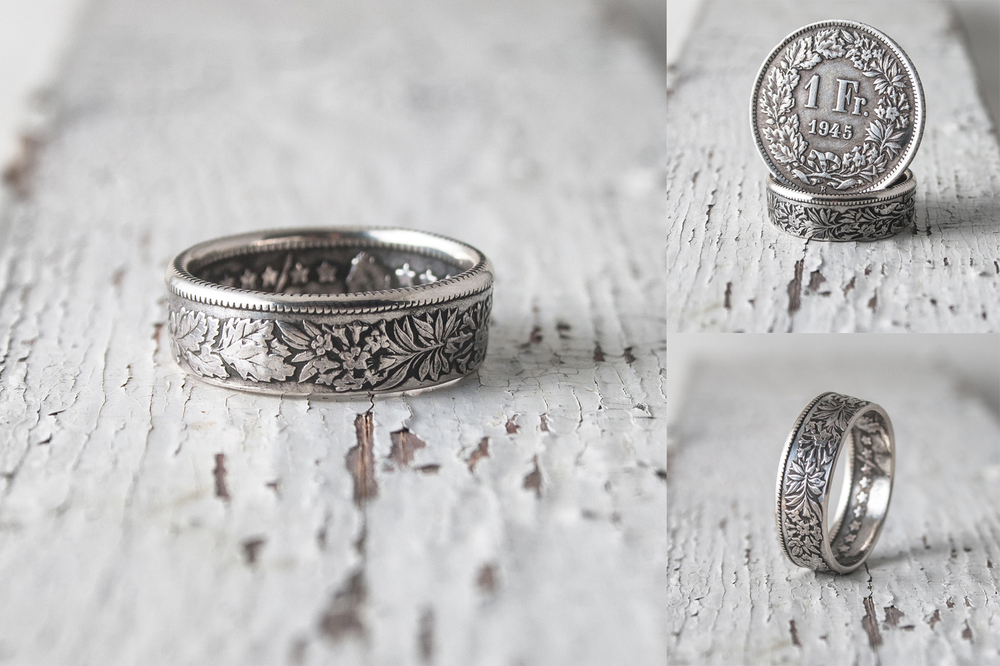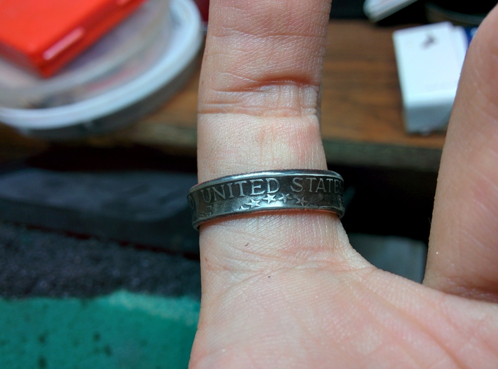 Начнем, пожалуй, с простого. Вырубаем у монеты середину, выгибаем шайбу в конус, догибаем до состояния прямого кольца с параллельными стенками, получается заготовка.