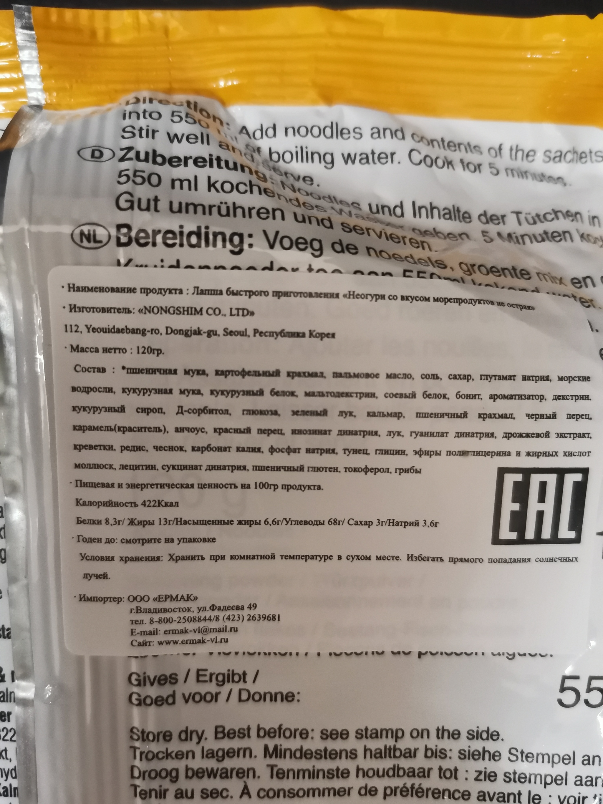 Лапша(рамен) с морепродуктами, неострая. В комплекте:суповая основа и сухие ингредиенты.