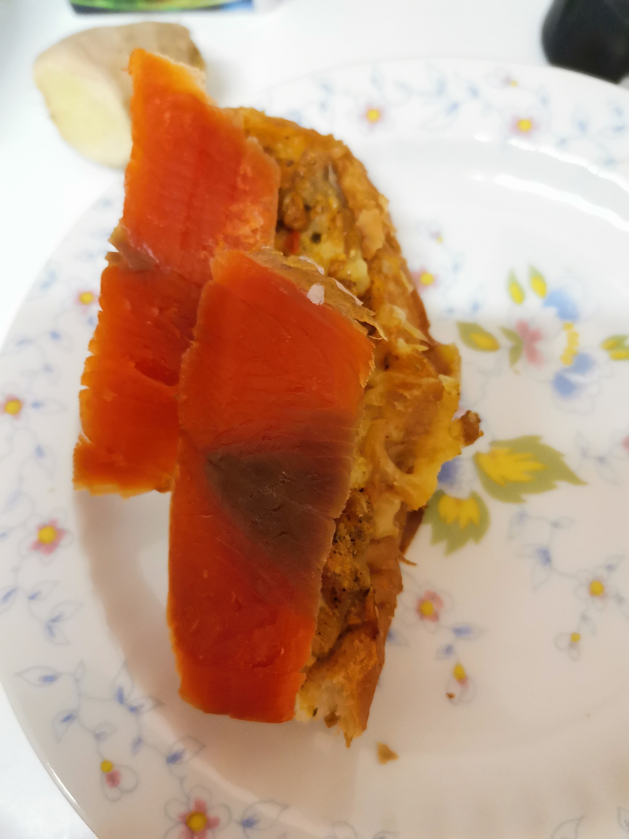 От морепродуктов здесь только морская капуста(её много и она приятно упругая), весёлые мордашки из сурими(наверное), безвкусные, сама героиня блюда показалась мне немного мучнистой, текстура напомнила обычные спагетти, и совсем не альденте. В целом, проходная лапшичка, без изысков, с едва ощутимой остринкой. Пришлось дополнить блюдо запеченым бутером, с минтаем и парой кусочков копчёной нерки(Камчатка, ты в моем сердечке))