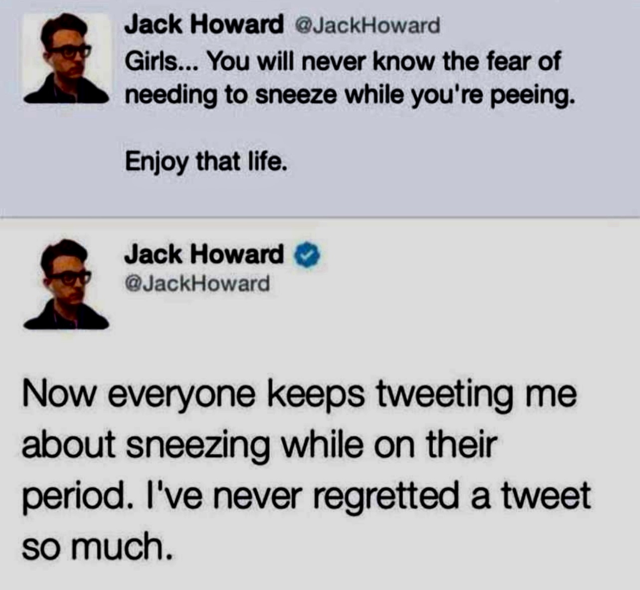 - Теперь мне все твитят про чихание во время месячных. Я никогда настолько не сожалел о твите.