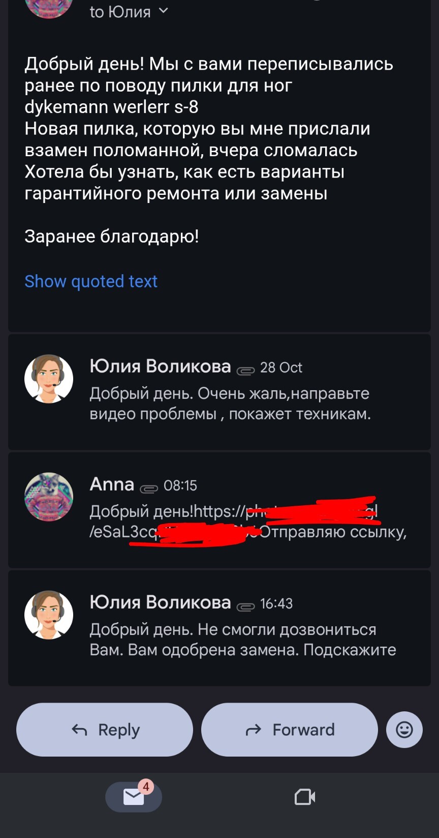 Но позавчера у меня сломалась и новая пилка и вот я снова написала и мне опять оформили замену без проблем и разбирательств.