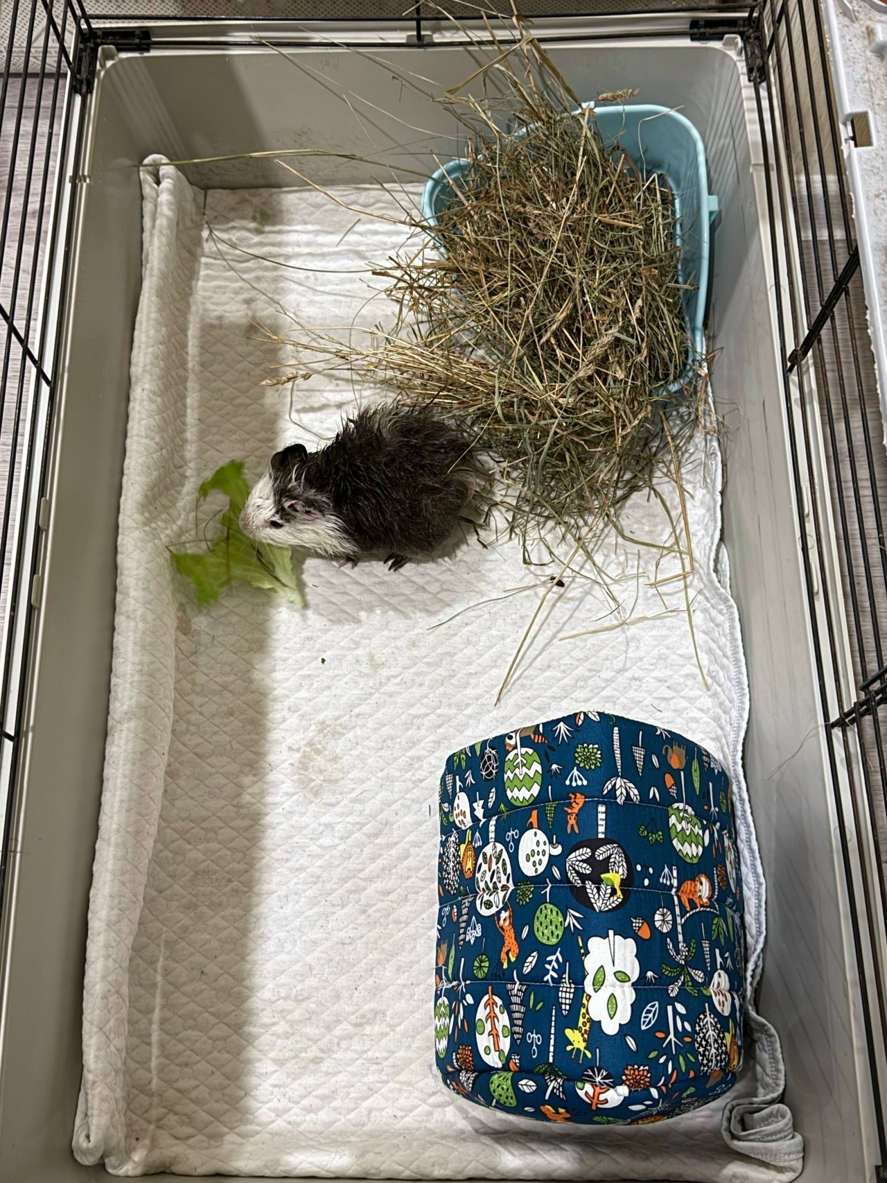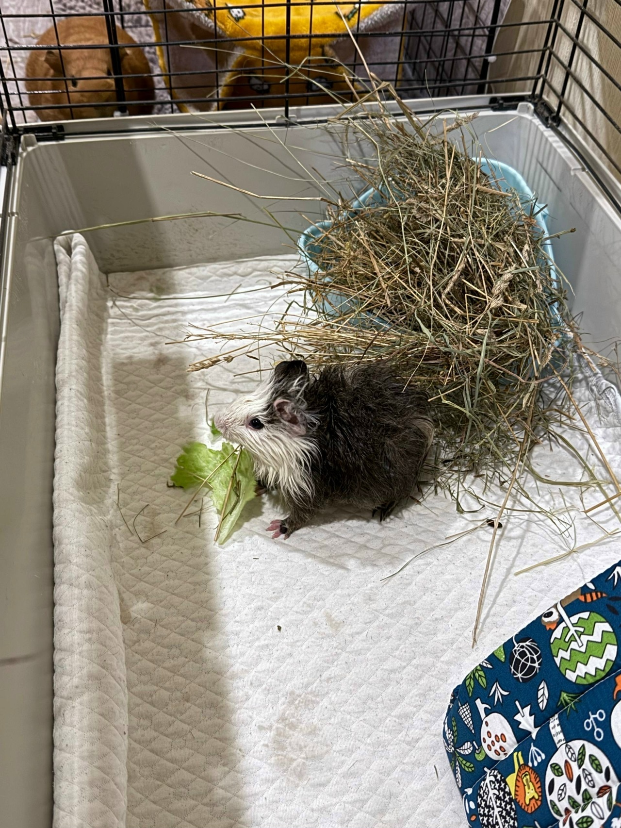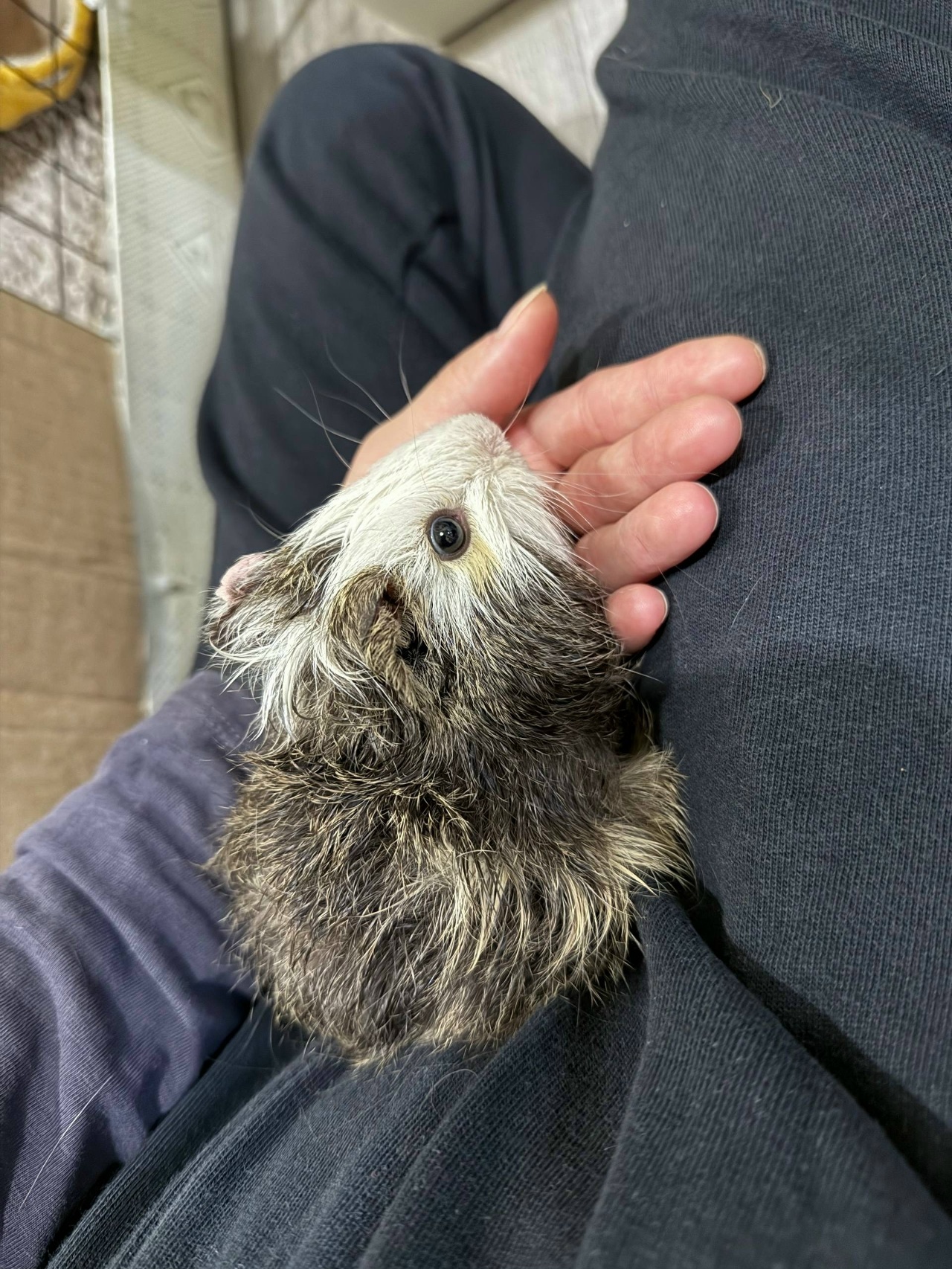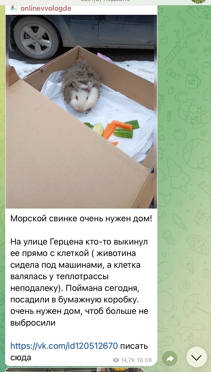 Вчера вечером дочь звонит и рассказывает, что ее муж днем в Онлайн Вологде увидел пост о морской свинке, которую люди нашли во дворе и пристраивают. У дочки и зятя дома живут 4 залюбленных морских свинтуса (у них большой загон, у каждой зверушки домик-гамак, свинки аж лоснятся), поэтому в стороне они остаться не смогли и поехали за свиненком. Выяснилось, что клетку с маленькой свинкой какой-то нелюдь выставил к помойке. От ветра клетка опрокинулась и морской свин начал бегать по двору. Как он не замерз на улице, непонятно! Тем временем во дворе развернулась целая спасательная операция, все ловили свинку, а он испугался такого внимания и спрятался под машиной. В конце концов был пойман и привезен домой. Это оказался маленький мальчик, месяцев трех, которого назвали Сёмушкой. Видимо, раньше Сёму содержали в плохих условиях, потому что от него очень пахло, а еще он весь худенький и тощенький. Худоба незаметна, т.к. он розеточный, то есть пушистый. Свиненка выкупали, высушили и накормили. Пока сидит отдельно от остальных свинок, на прием к врачу записан на вторник