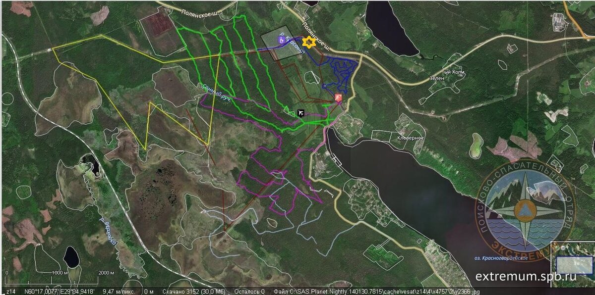 Лесное воплощение Джона Крамера встретило спасателей на фиолетовом треке. Потерявшийся мужчина был найден прямо у дороги кинологической группой ПСО "Отклик", на карте место отмечено жёлтой звёздочкой.