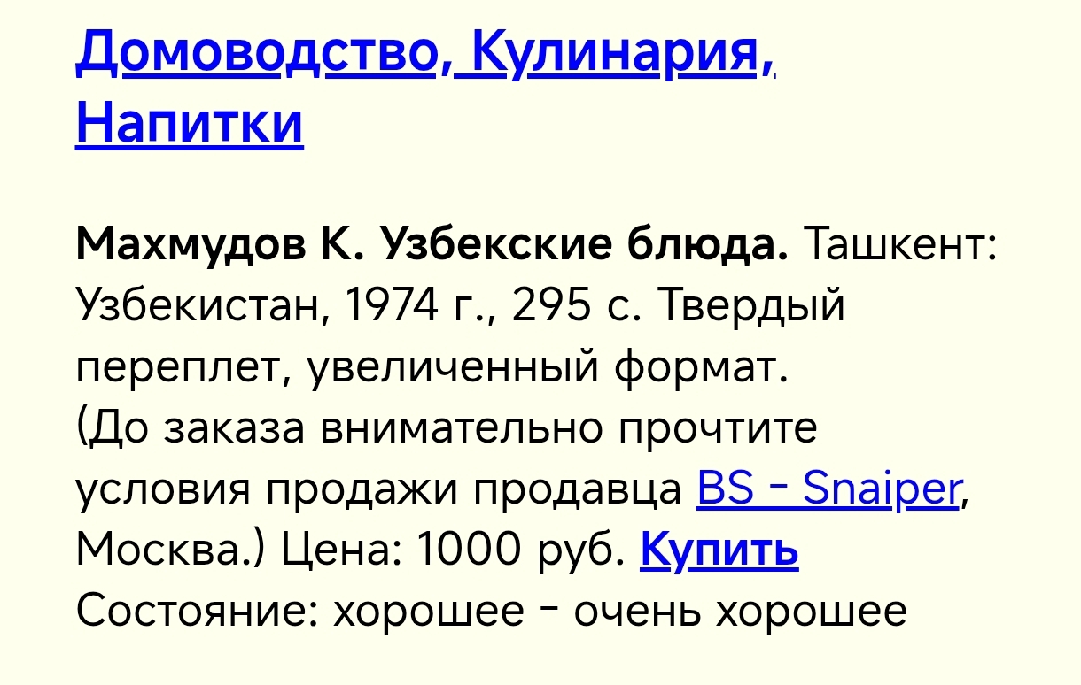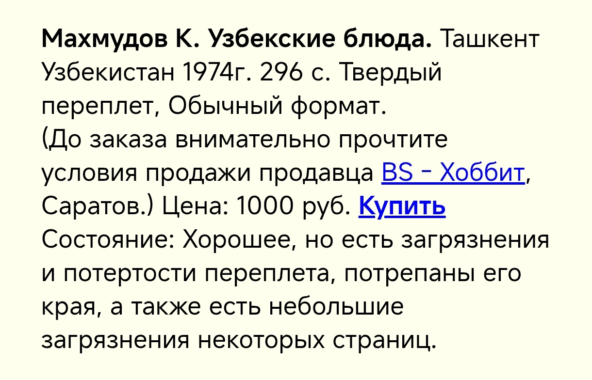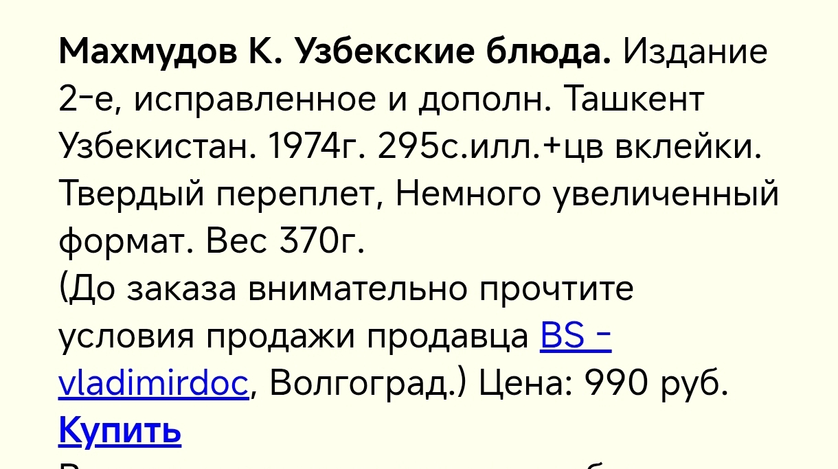 И я (немного фанат готовки) попросила книгу "Узбекские блюда" Махмудова. Честно, не знала, что это редкость. Просто неоднократно попадалась информация, что книга прям нужная.