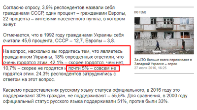 Забавно, что новость на корре показана нейтрально, а здесь есть манипуляция. Так, здесь пишут, что 60% гордятся гражданством. Хотя из текста ясно, что это не так. Что 60% считают себя гражданами.
