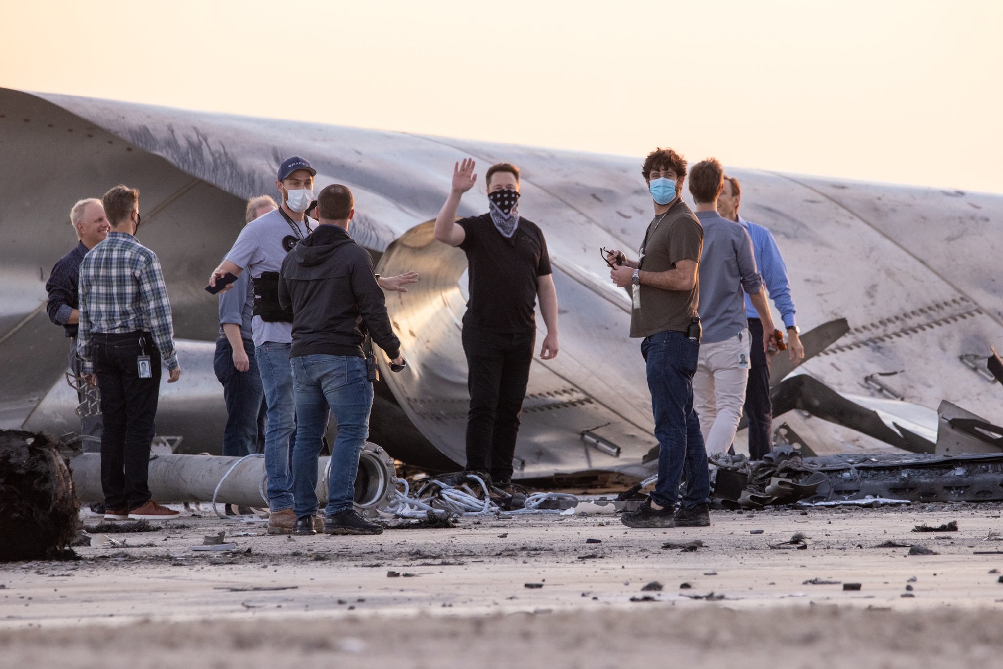 Руководство и команда инженеров компании SpaceX осмотрело развалины прототипа SN8. На площадке были замечены Илон Маск, Гвинн Шотвелл, Стив Джурветсон, команда инженеров программы Starship и главный советник по быстрым разборкам - Марвин 🐶
