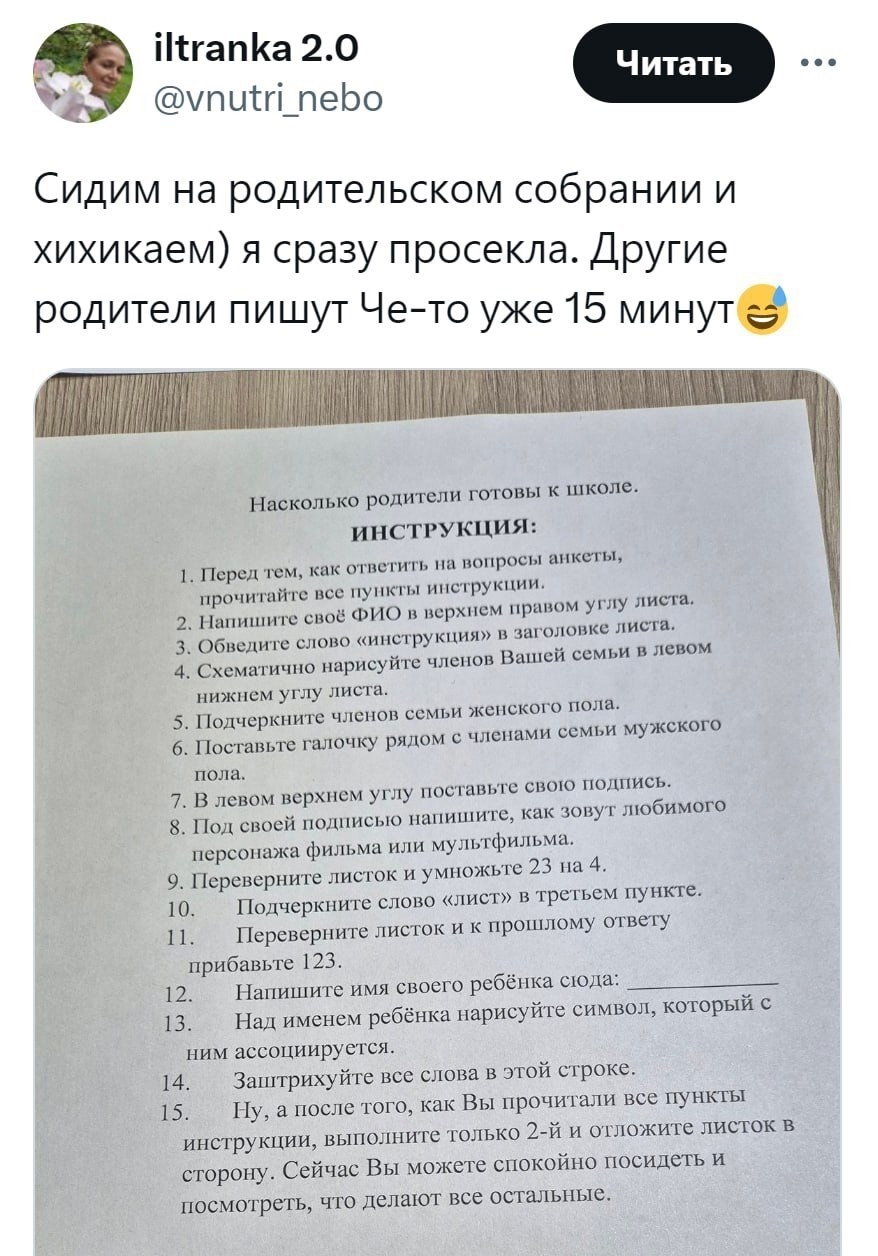 11599 Perevalka Неуклонно стервенею Всё обо всём Юмор Неплохо1 Серия Приколы для глазастых 1 год назад Скриншот X (Twitter) Инструкция Родительское собрание Школа Юмор 462 43 23 8 3 Ещё 0