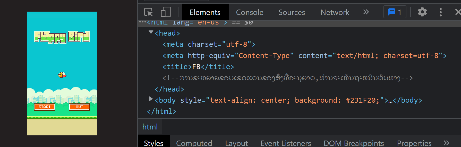 В коде страницы игры был найден комментарий на лаосском (спасибо переводчикам). Перевод: "Раздвинув границы дозволенного, ты увидишь дорогу".
