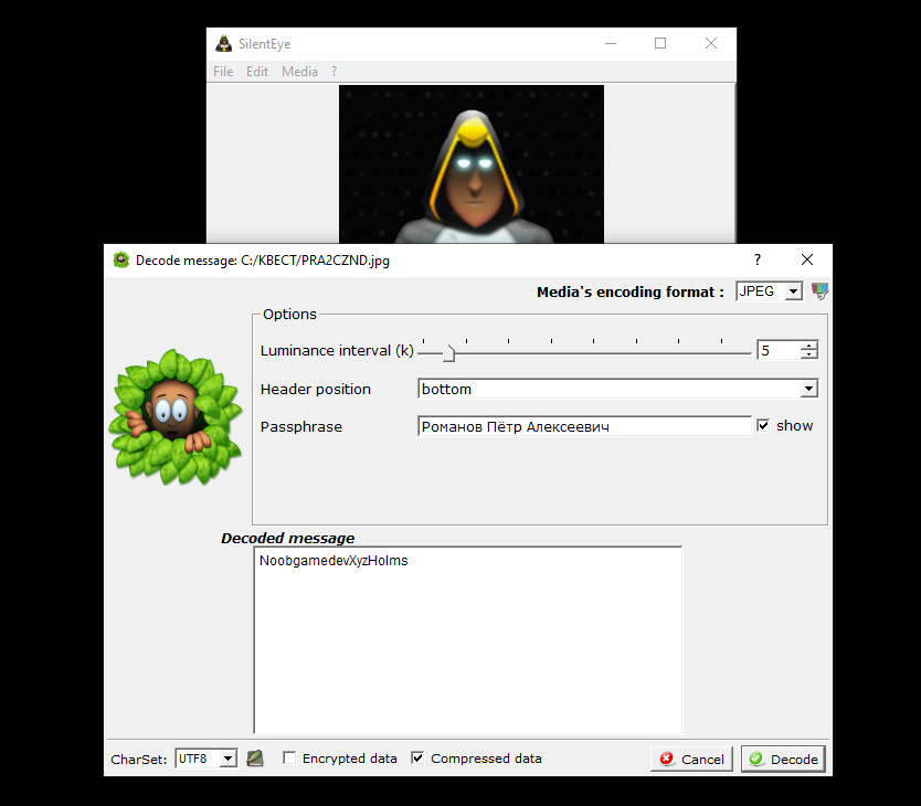 Совокупность этих данных привела к мысли, что в файле спрятано что-то при помощи программы SilentEye, и что пароль связан с Петром I. Поэтому спустя время, был подобран пароль, которым оказались Ф.И.О. императора.