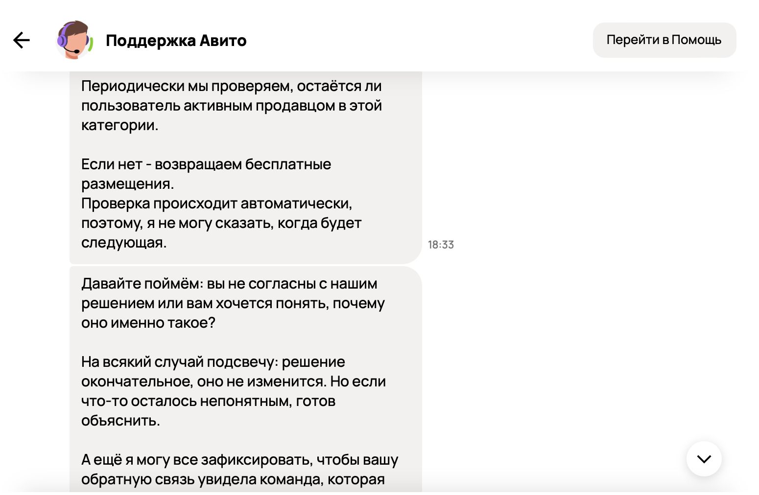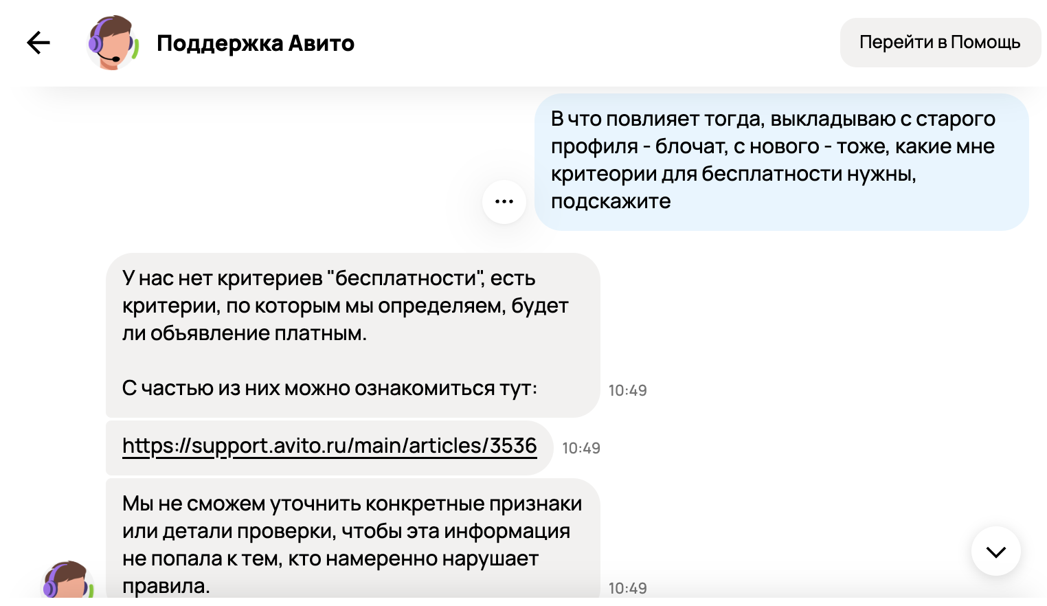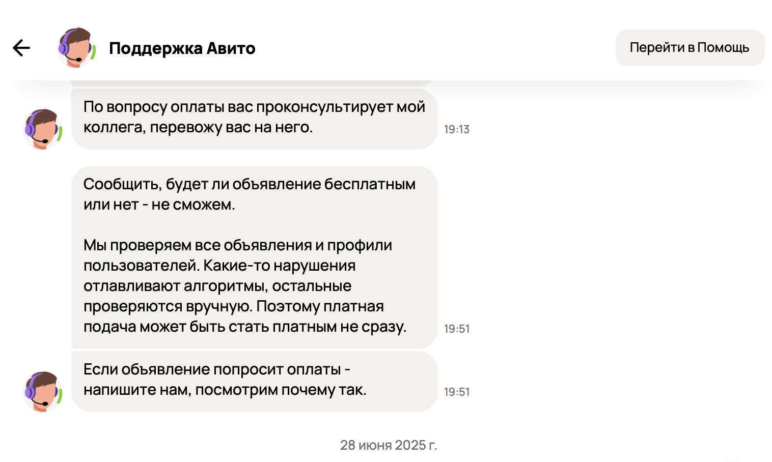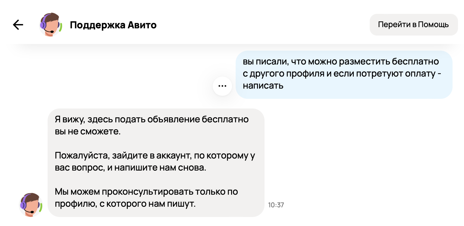 Ок, идея продажи была отложена. В июне, по истечении данного срока, объявление было размещено заново. И, сюрприз, заблокировано с предложением отплатить размещение (по т.н. «перекупскому тарифу», что-то в районе 6-7 тысяч рублей). Переписка с поддержкой дала следующее: