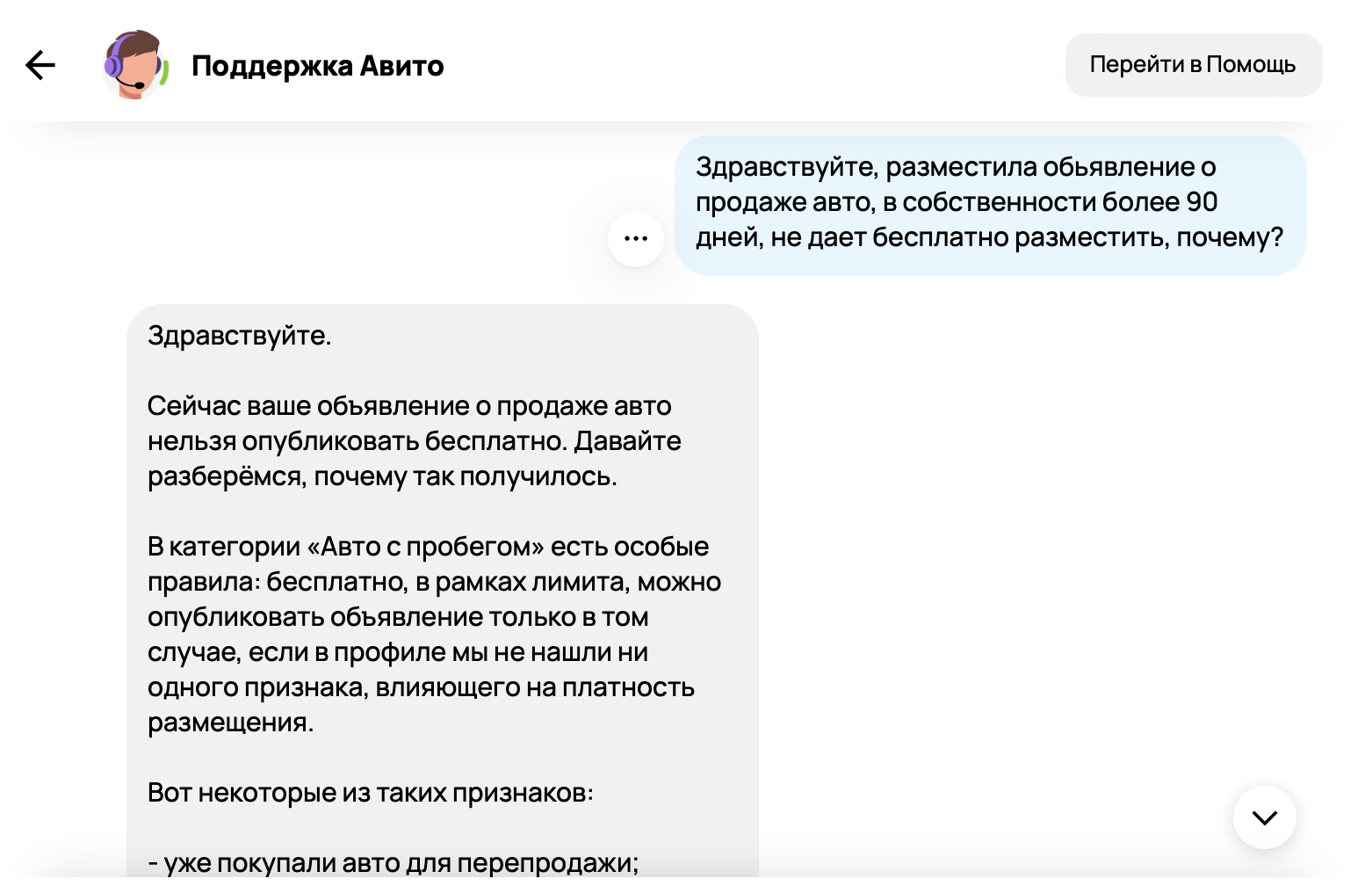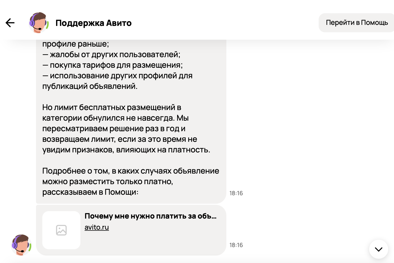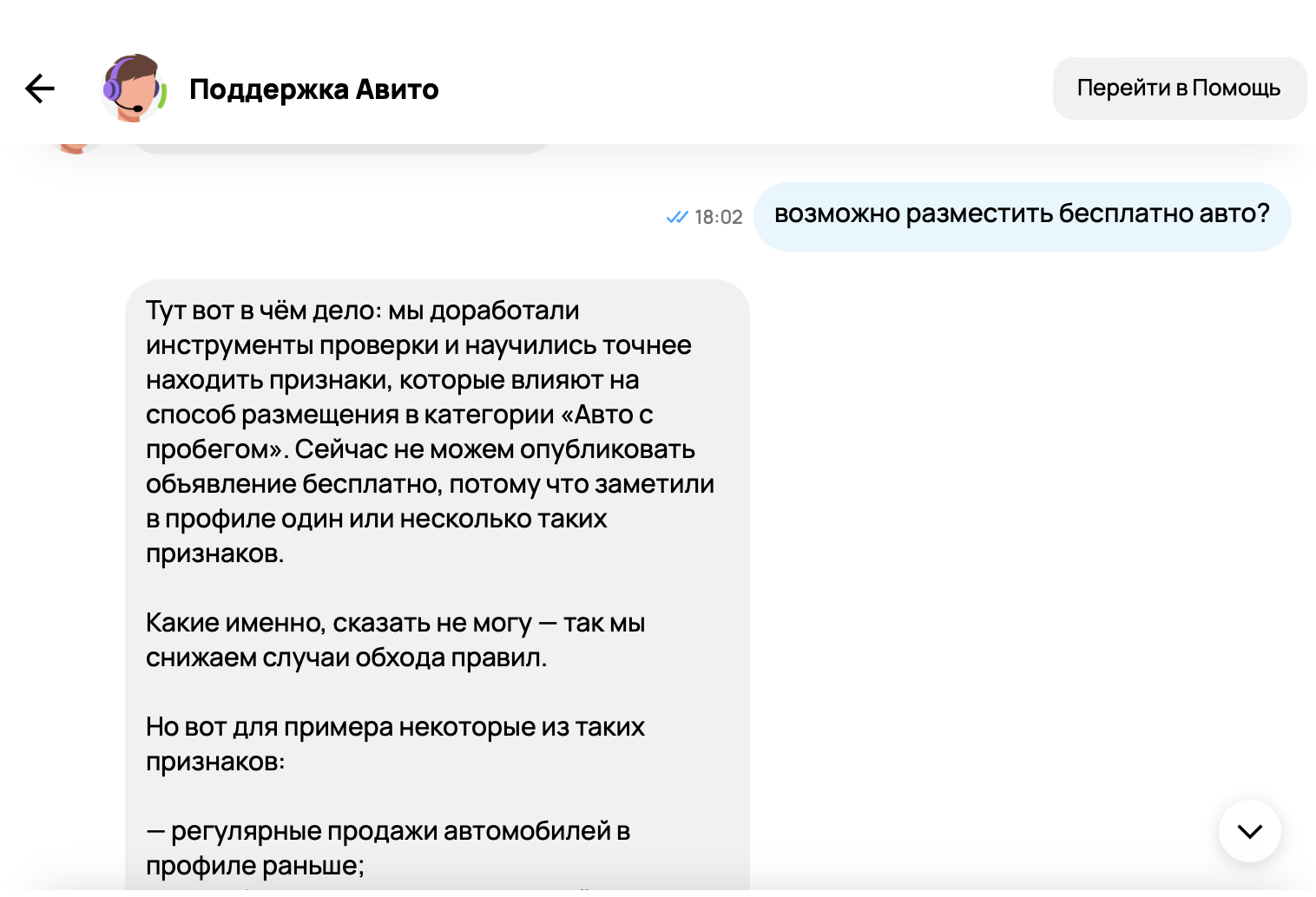 Ок, идея продажи была отложена. В июне, по истечении данного срока, объявление было размещено заново. И, сюрприз, заблокировано с предложением отплатить размещение (по т.н. «перекупскому тарифу», что-то в районе 6-7 тысяч рублей). Переписка с поддержкой дала следующее: