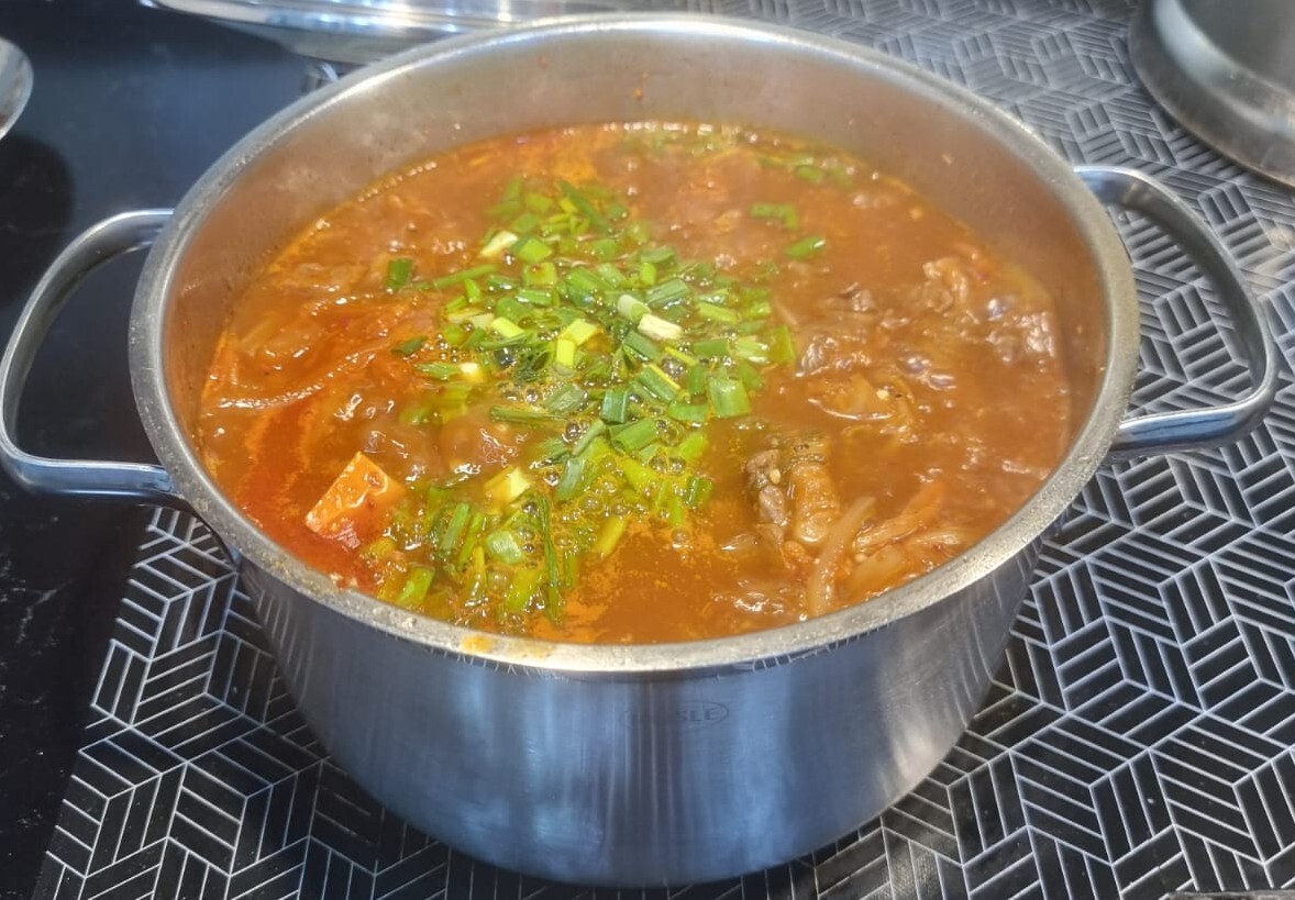 Кимчи я бросил в кастрюлю после всех составляющих. Долго решал проверить и наконец то решился. Отлично вышло. Мясо успело слегка приготовится, прежде чем в него поступила кислота. Тут уж простите и не казните.