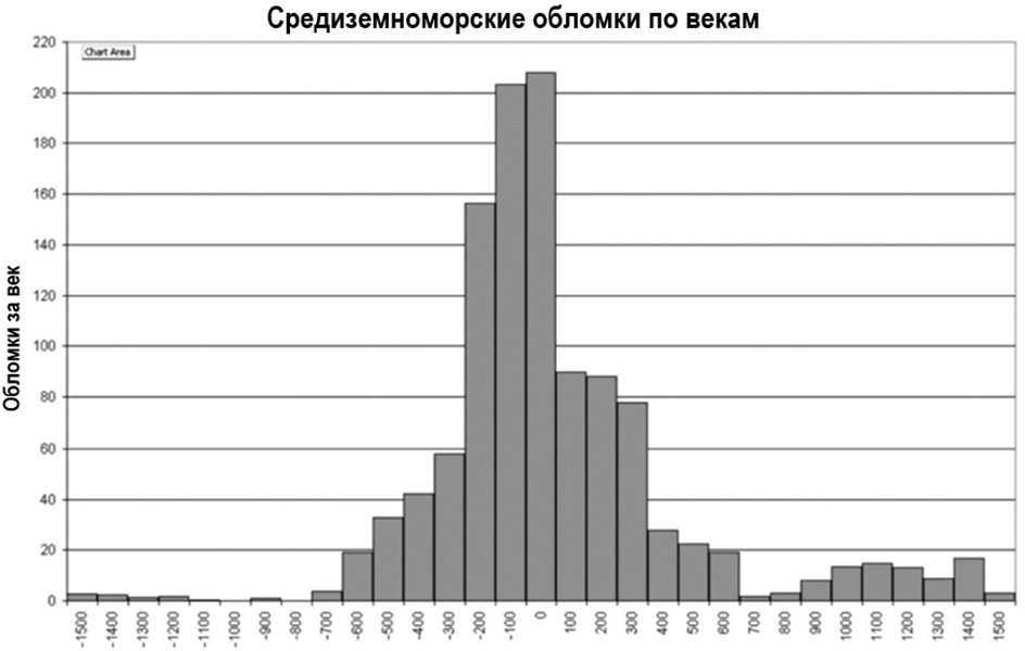 По этому графику выходит, что в 1-2 веках н.э. в Средиземном море тонуло огромное число кораблей, а потом оно резко снижалось до того, что в Средние века тонуло в десятки раз меньше кораблей. Из чего делается вывод, что в римскую эпоху движение кораблей было крайне интенсивным, а с 3 века начало резко сокращаться и даже в 15 веке оно не восстановилось.