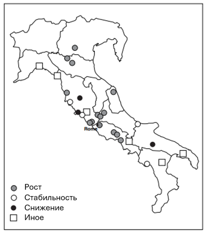 Статистика изменения численности свободного населения в Италии с 200 г. До н.э. по 100 г. н.э. в регионах, где зафиксирован рост числа вилл [21: с. 180-181]
