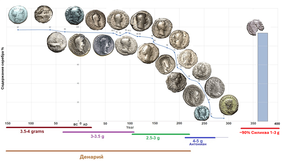 При этом на проблемы с серебром оказывали влияние ещё два фактора: во-первых, оно утекало из экономики через покупку у Индии роскоши (китайского шелка, специй), а во-вторых, с конца 2 века н.э. наблюдалось снижение добычи серебра. Иногда вообще можно увидеть утверждения, что у империи в 3 веке серебро просто кончилось. Но это не совсем так. Действительно, археология свидетельствует о том, что в Иберии с конца 2 века снизилась его добыча [26: c. 1]. Однако, роль испанского серебра в монетной политике империи уже в 1 веке н.э., на пике добычи, была не определяющей, и заметное место заняло серебро из Галлии, Балкан, Малой Азии [21: с. 321].