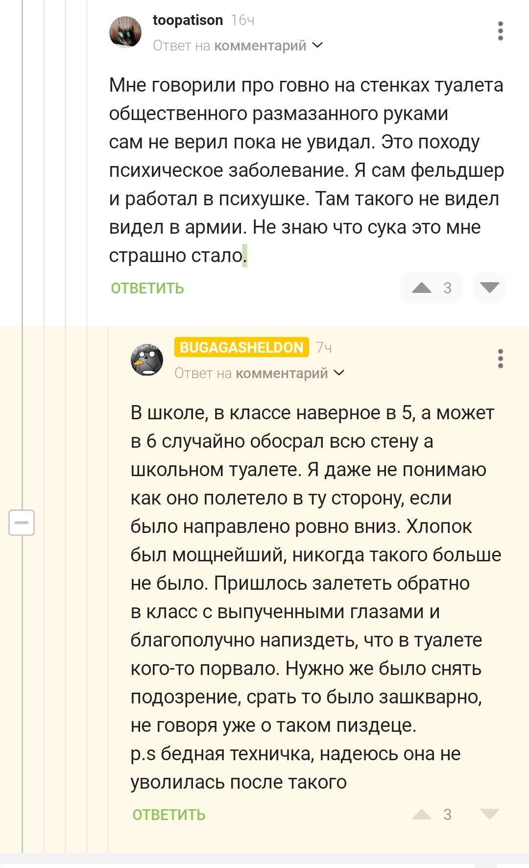6 BUGAGASHELDON Неприятная ситуация 1 день назад Думаю пусть будет отдельным постом. Вспоминаю и бросает в дикий смех с такого пиздеца🤣 [моё] Комментарии на Пикабу Туалет Школа Стыд Фекалии Мат 2 Ещё 0