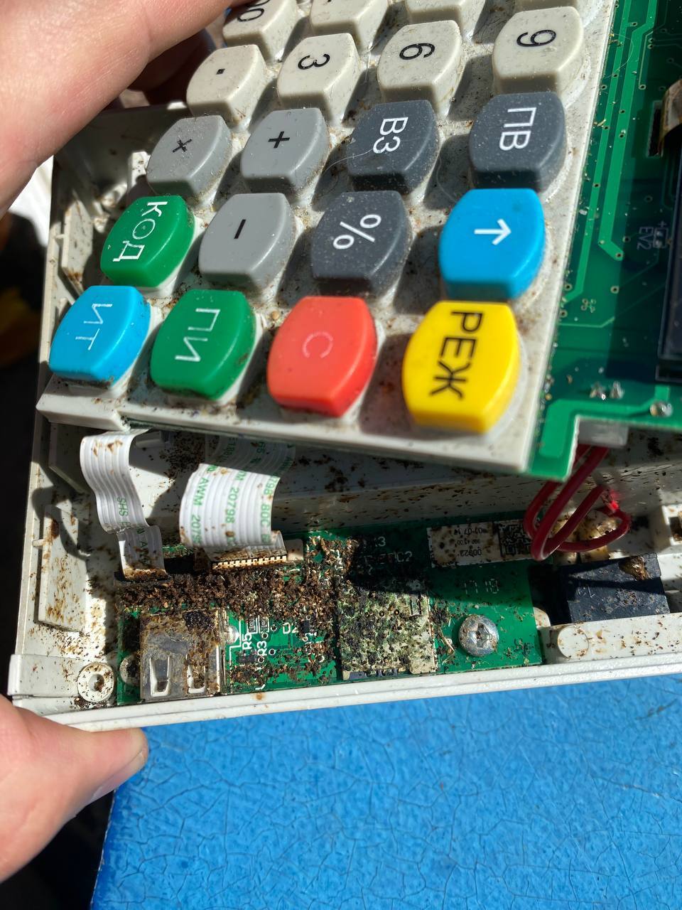 После такого зрелища, конечно, вопросы отпадают, почему касса не работает. Ещё повезло, что она год отработала, и продолжает работать после вмешательства с заменой некоторых узлов.