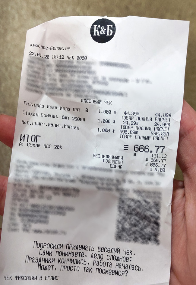 18 LxLaeda 5 лет назад Серия Смешные и странные наблюдения Непросто сочинять тексты к кассовым чекам В январе вот такой "веселый" чек с "веселыми" цифрами попадался [моё] Чек Алкоголь Красное&Белое Ещё 0