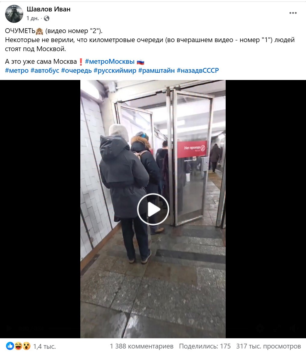 Сёрфя сегодня Фейсбук(*Признан экстремистской организацией и запрещен на территории РФ), обнаружил пост некоего, судя по личным данным, белоруса, топящего за Украину и проживающего в Грузии. Пост содержал видео очереди из людей, стоящих около метро "Щёлковская" в Москве, в один из дней после снегопада на прошлой неделе, когда на дорогах случился снежный коллапс, и общественный транспорт, да и не общественный тоже, ходил, мягко говоря, так себе.