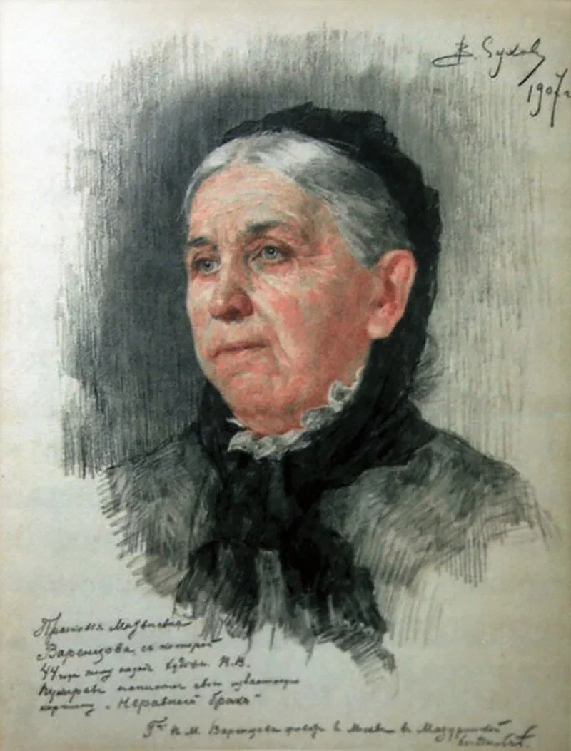 И это породило вторую версию. Она утверждает, что в такую ситуевину попал сам художник. Там целое расследование – Пукирев действительно упустил невесту похожим образом (говорю же, ситуация частая), потом и находили портрет Сухова с подписью: «Прасковья Матвеевна Варенцова, с которой 44 года назад художник В. В. Пукирев написал свою известную картину «Неравный брак». Госпожа Варенцова живёт в Москве, в Мазуринской богадельне».