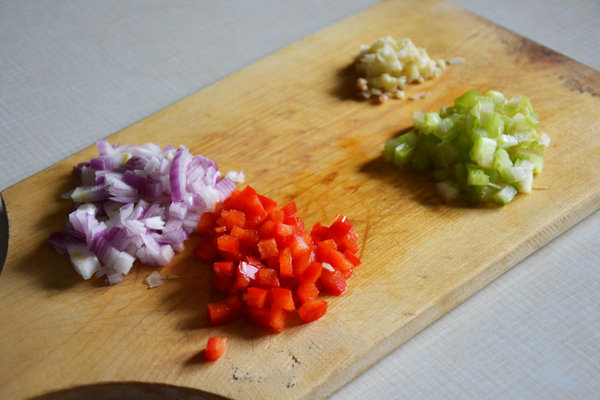 Мелкими кубиками режем овощи, они должны быть примерно одного размера. Кроме чеснока, его изничтожаем в пыль.