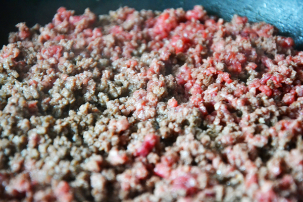 На 7 из 10 огня начинаем обжаривать фарш, это самый занудный момент, потому что нам надо лопаточкой развалить фарш до однородного состояния. Дожариваем до полуготовности, чтобы вроде как коричневый, но с сырыми кусочками. Добавляем смесь специй и перемешиваем. Обжариваем до момента, когда весь фарш станет коричневым.