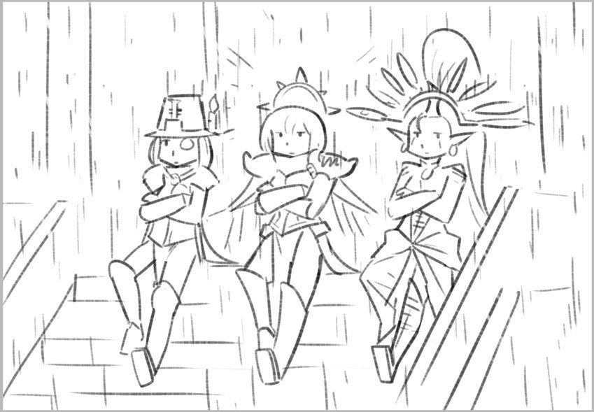 Грейфакс, Селестина и Иврейн ждут, когда прекратится дождь.