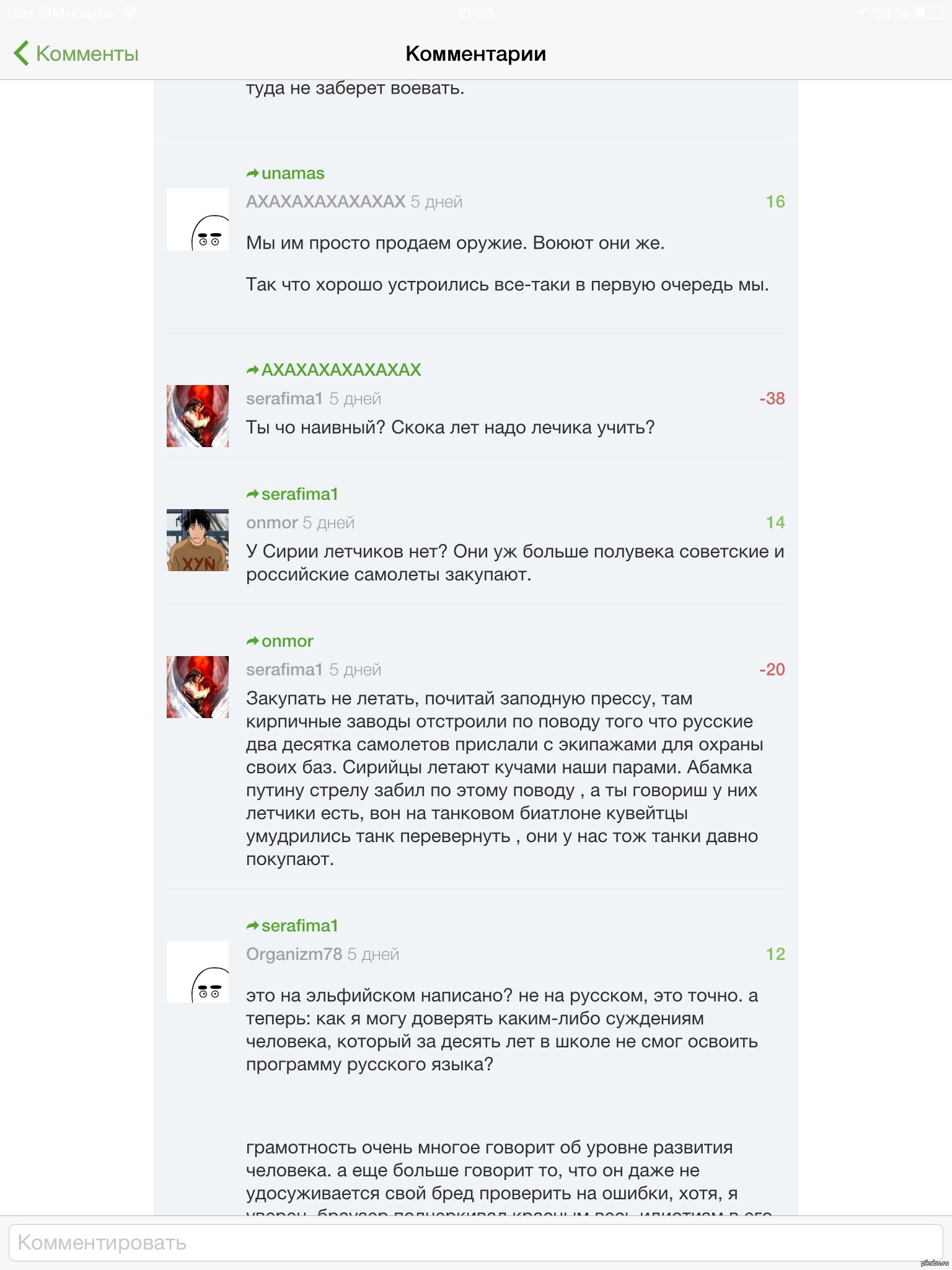 38 serafima1 Несколько дней назад, обсуждали полеты российских ввс в сирии. 10 лет назад Все были убеждены что на российских самолетах будут летать только сирийские летчики... Куку вам пикабушники за ваши минусы. Слабоумие Отвага Политика